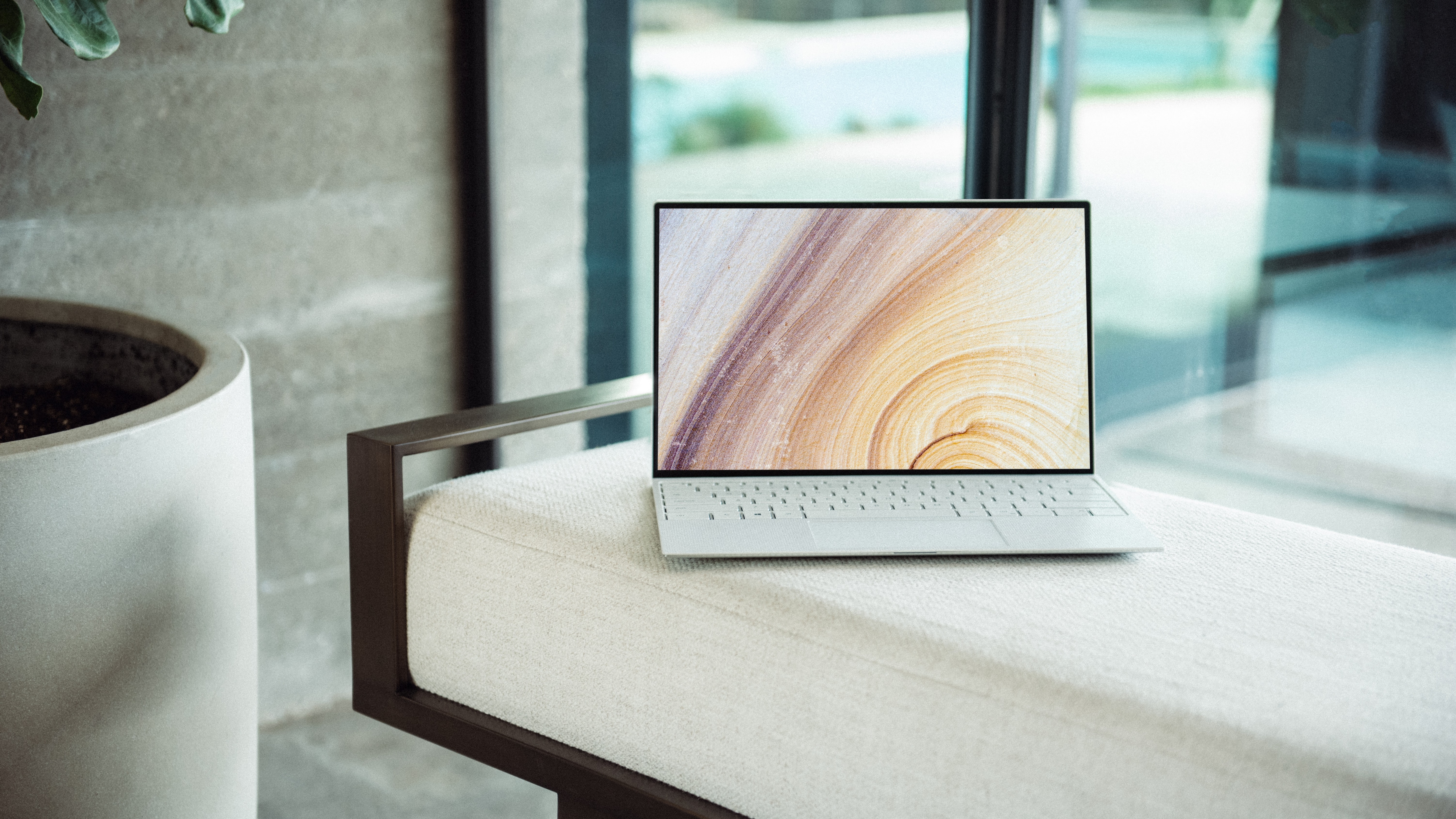 Description: A laptop computer sitting on a bench next to a potted plant and window sill in a room.