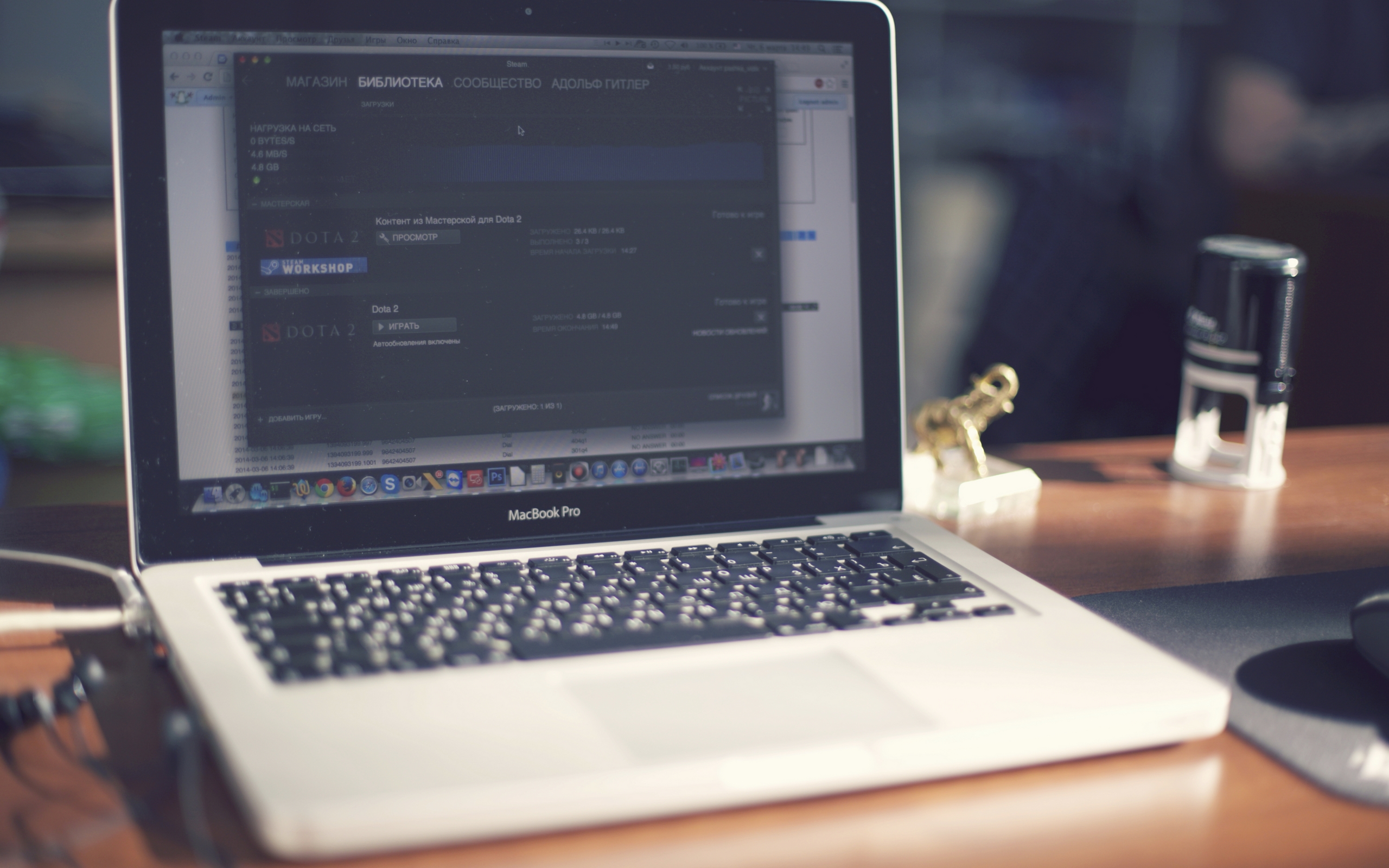 Description: A laptop computer sitting on top of a wooden desk next to a mouse and a glass of water on a table.