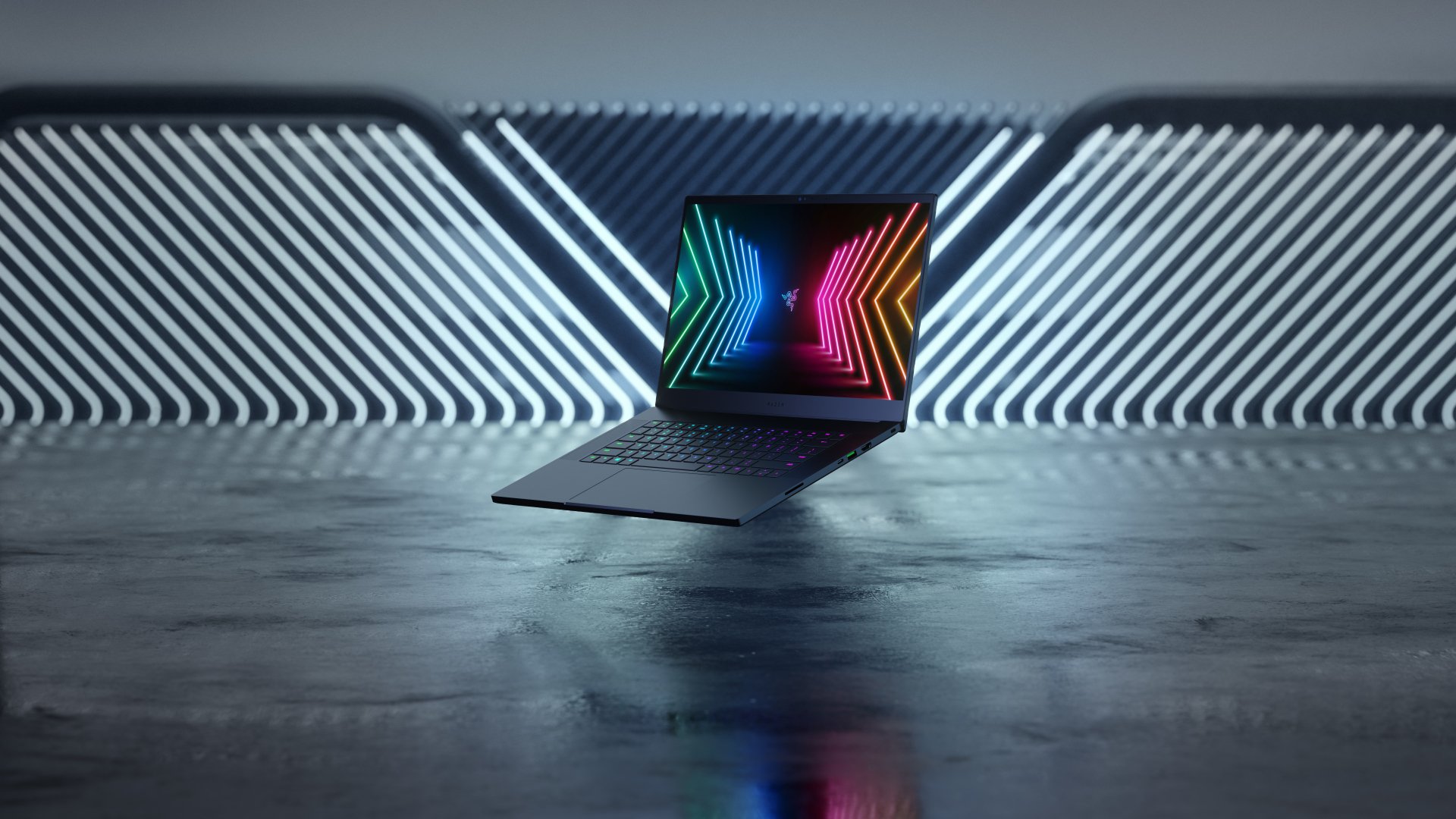 Description: A laptop computer sitting on top of a table next to a wall of lines and a neon light behind it.