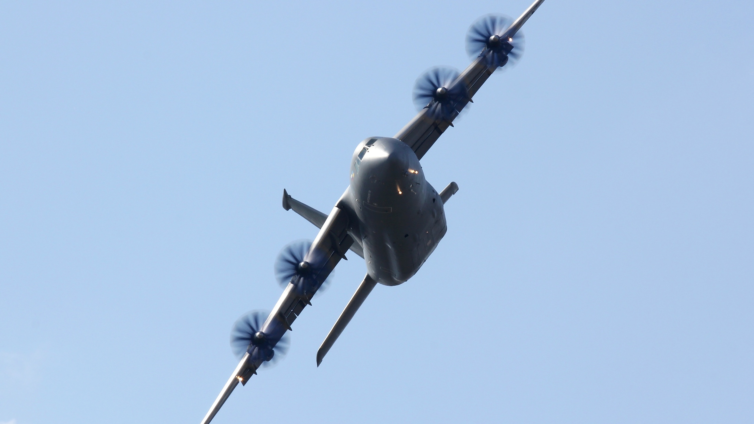 Description: A large airplane flying through a blue sky with smoke coming out of it's wings and a propeller.