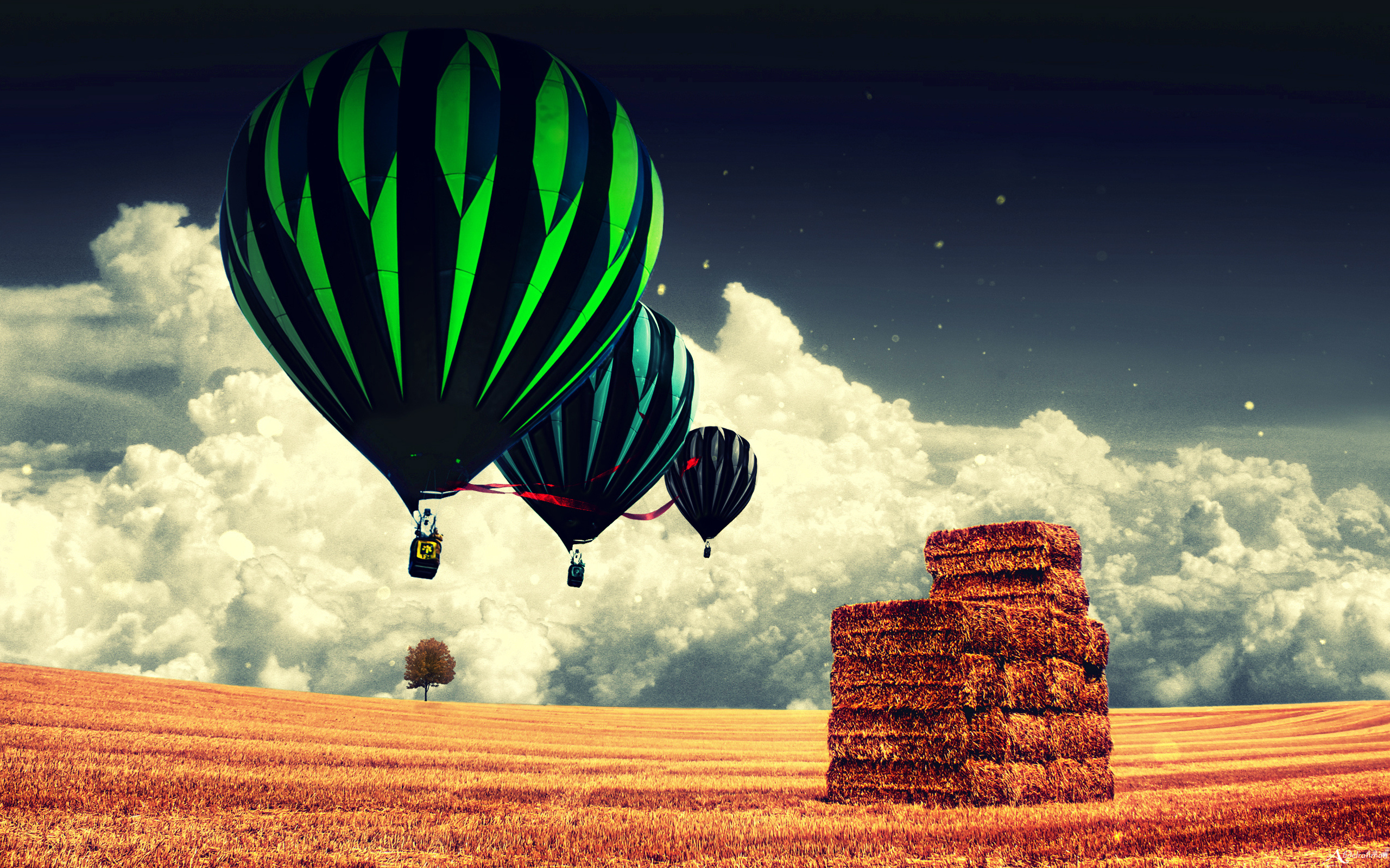 Description: A large balloon flying over a field with a stack of hay in the foreground and a tree in the background.