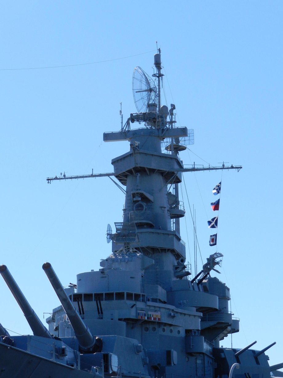 Description: A large battleship with a lot of guns on it's side and a flag flying on top of it.