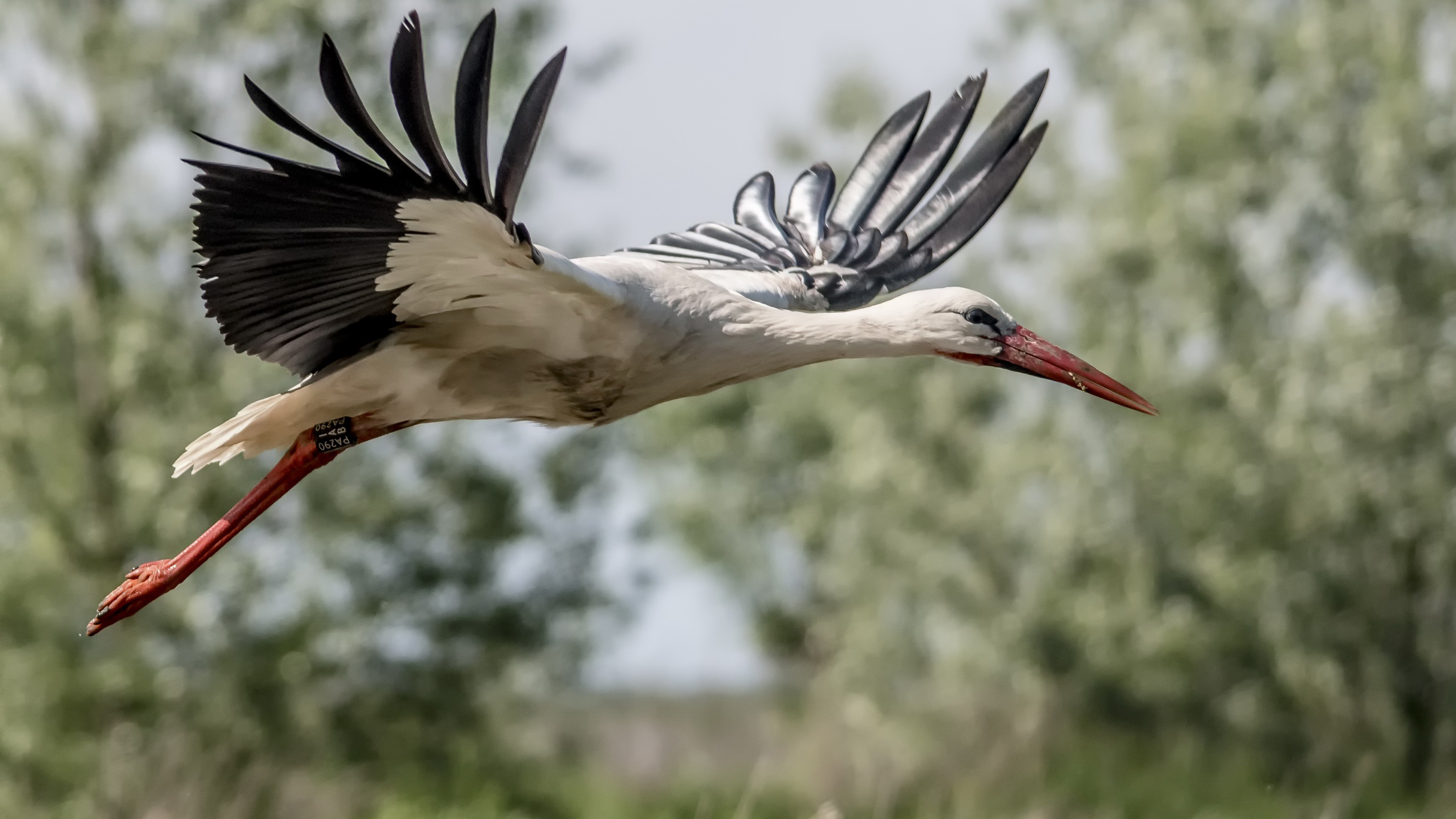 Description: A large bird flying through the air with trees in the background and a sky background with clouds and trees.