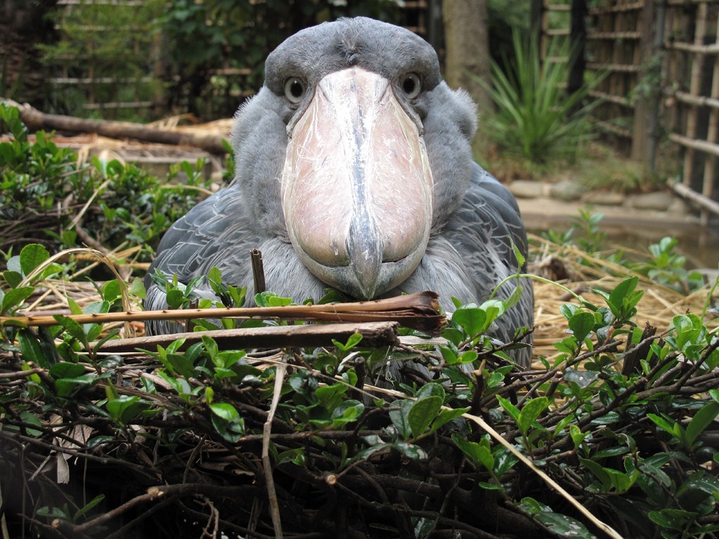 Description: A large bird with a large beak sitting in a tree filled area of leaves and branches in a zoo.