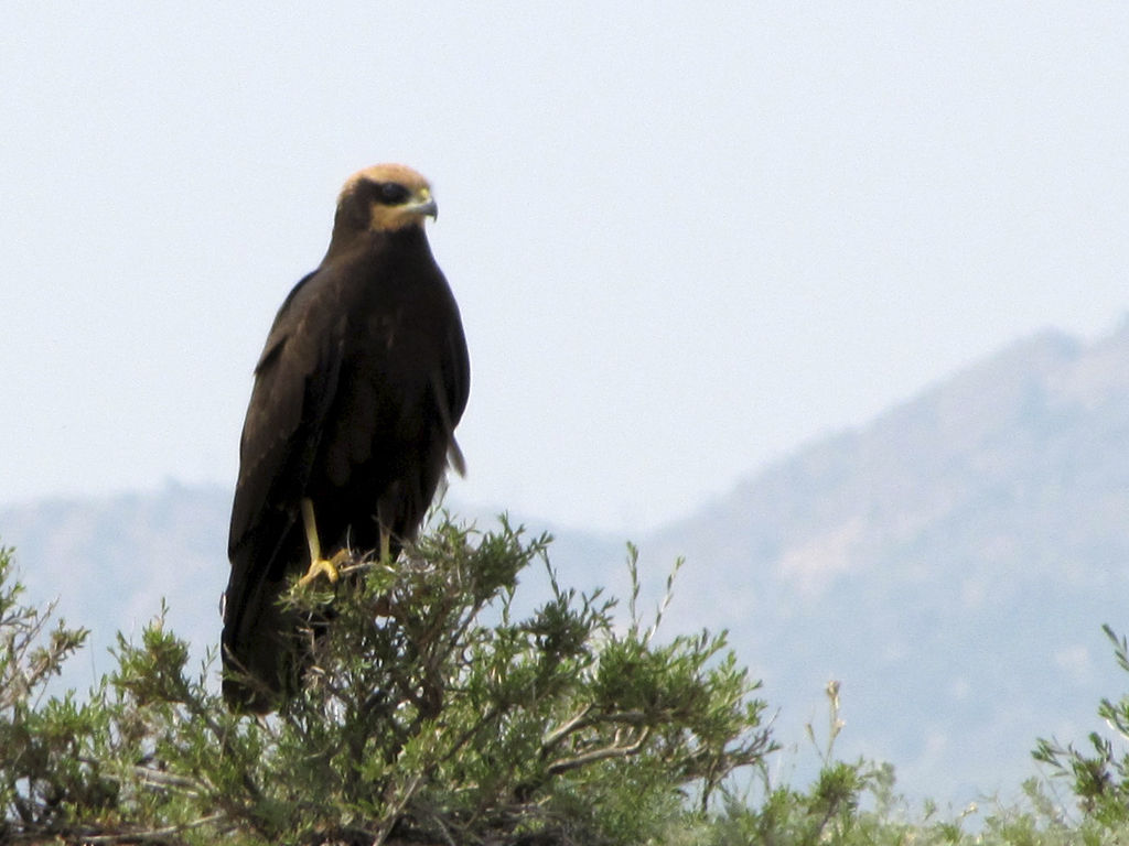 Description: A large bird perched on top of a tree branch in a field of grass and bushes with mountains in the background.