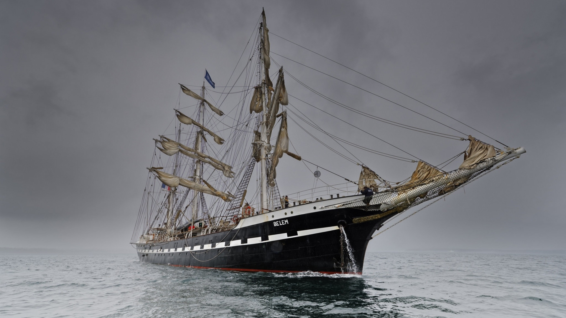 Description: A large black and white boat in the ocean on a cloudy day with people on it's deck.