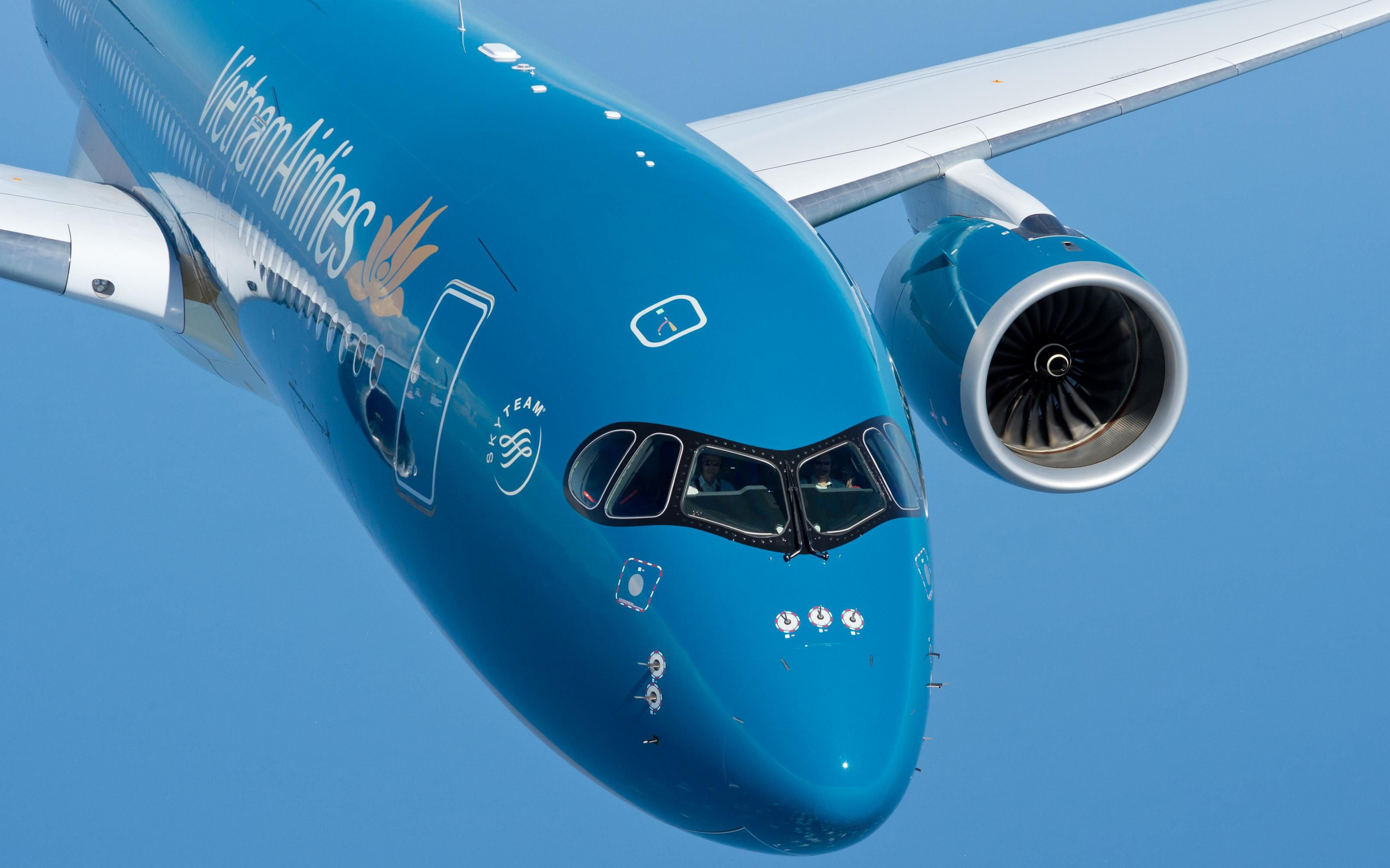 Description: A large blue airplane flying through a blue sky with a jet engine on it's side and a window on the side of the plane.