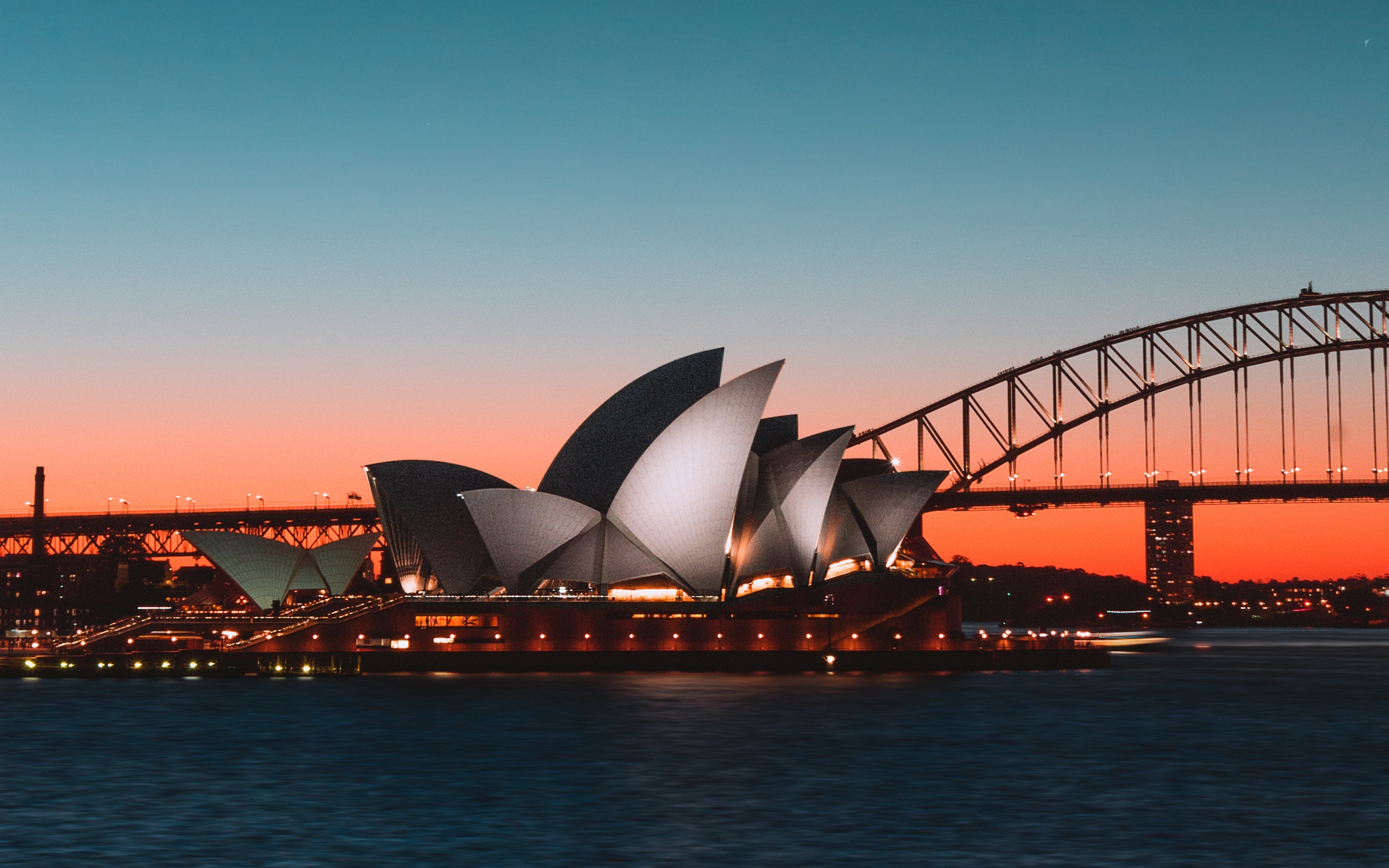 Description: A large boat in the water near a bridge and a bridge in the background at sunset or dawn with a large bridge in the background.