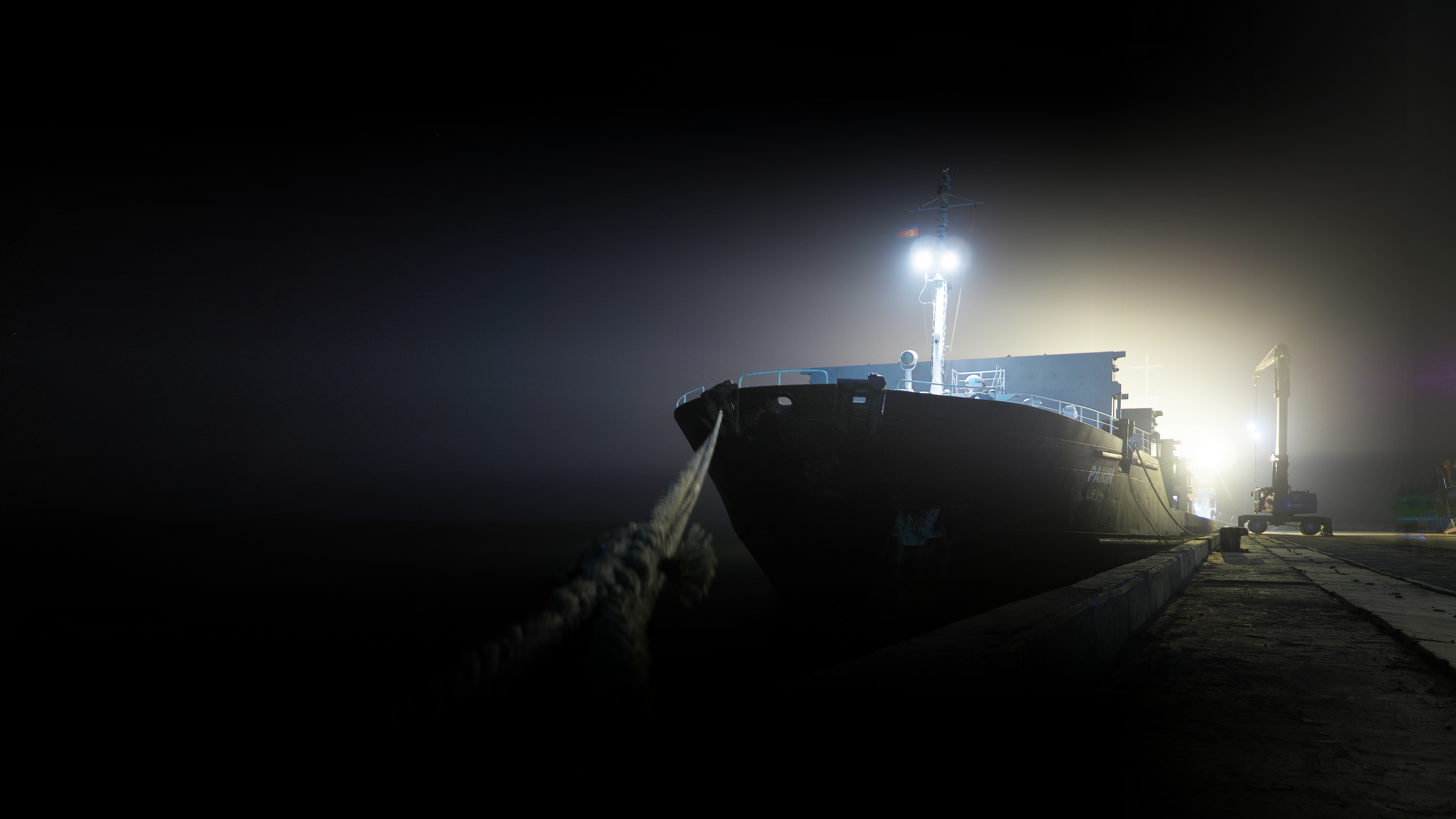 Description: A large boat is docked at a dock at night time with a light on it's side and a person walking on the dock.
