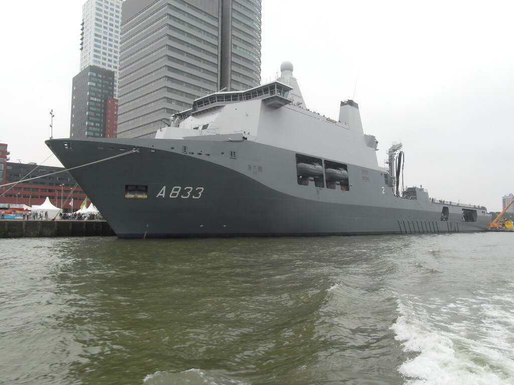 Description: A large boat is docked in the water near a city skyline with tall buildings in the background and a boat in the foreground.
