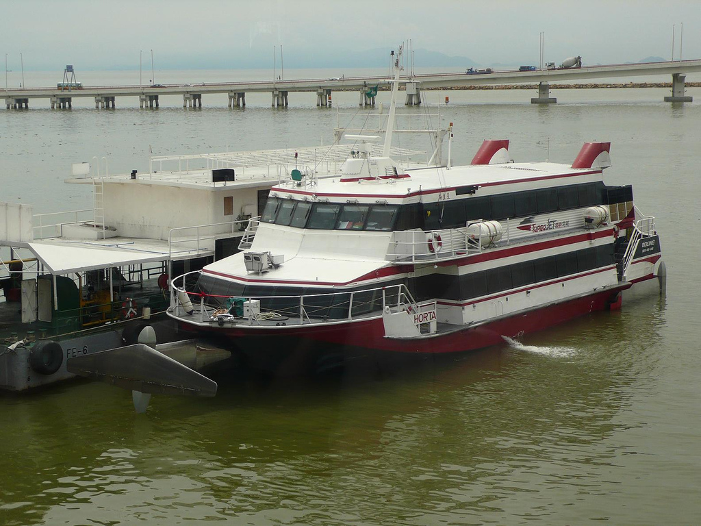 Description: A large boat is docked at a pier near a bridge and a body of water with a boat in it.