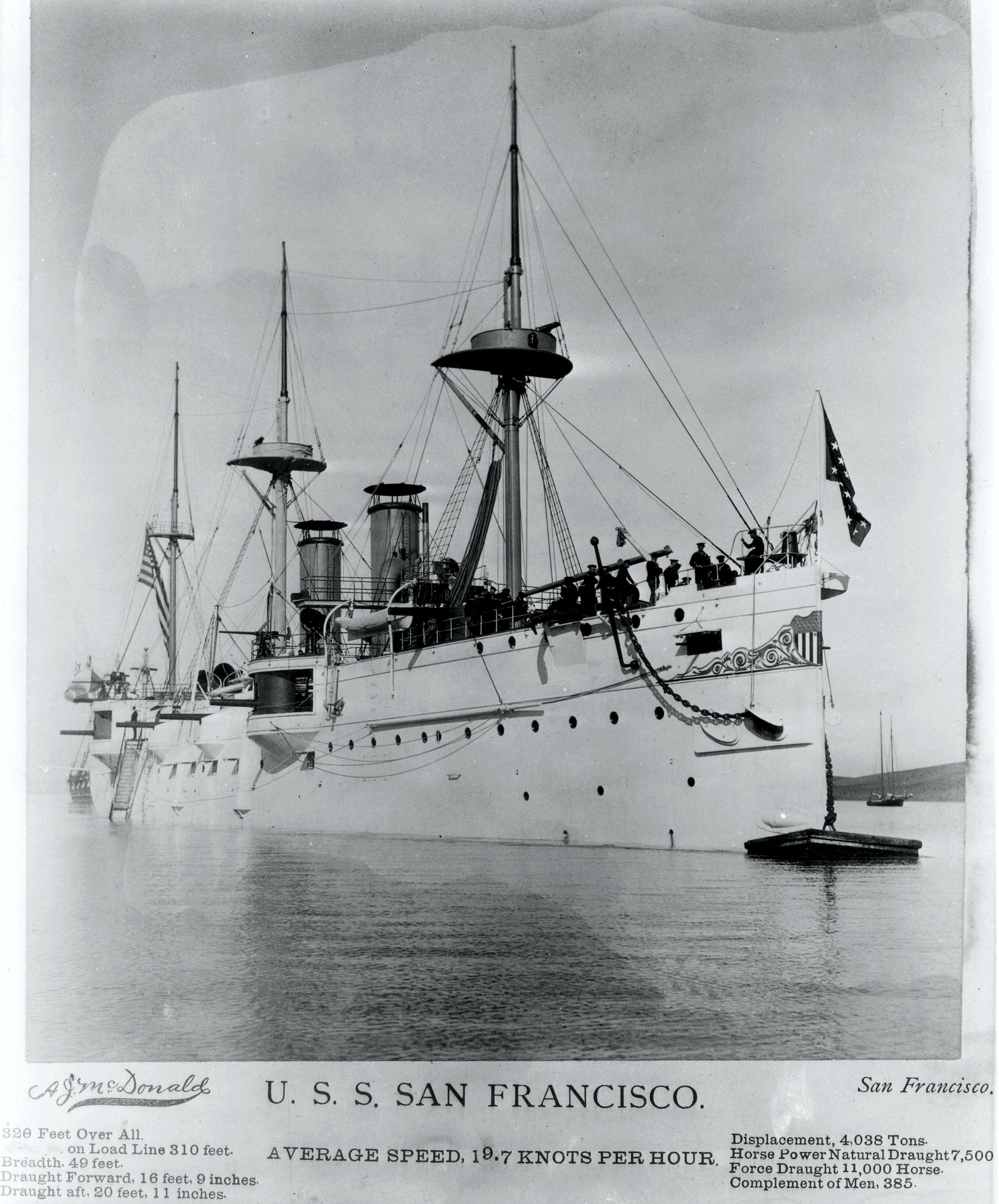 Description: A large boat floating on top of a body of water next to a boat with a flag on it.