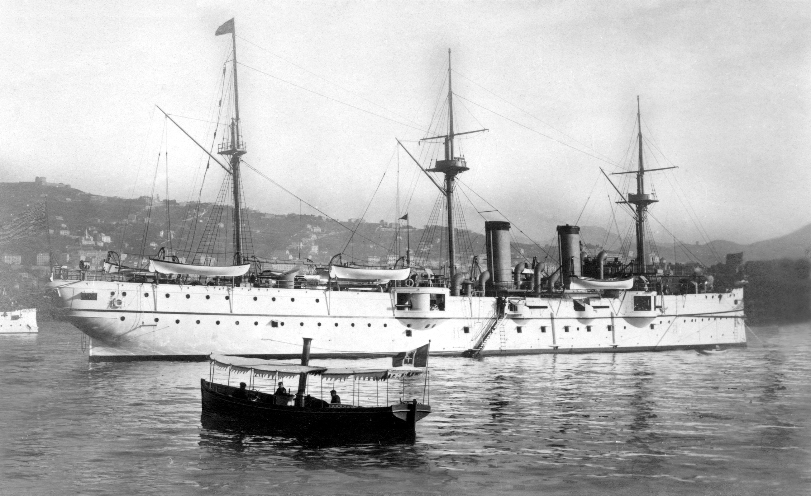 Description: A large boat floating on top of a body of water next to a boat with a smaller boat on it.