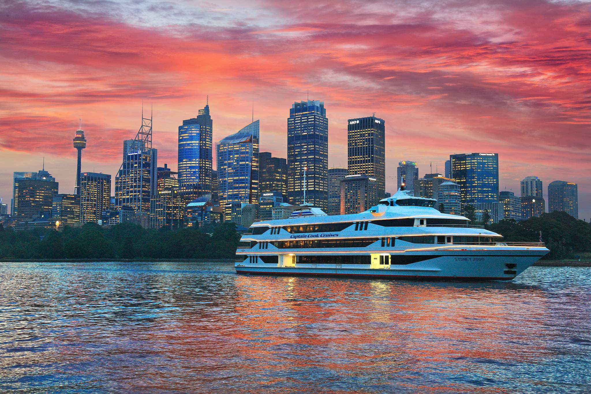 Description: A large boat floating on top of a lake near a city skyline at sunset with a pink sky in the background.