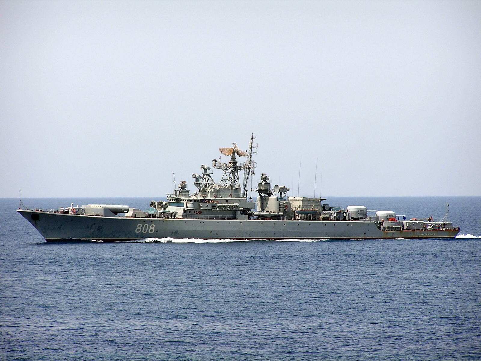 Description: A large boat in the middle of the ocean with a flag on it's mast and a flag on the bow.