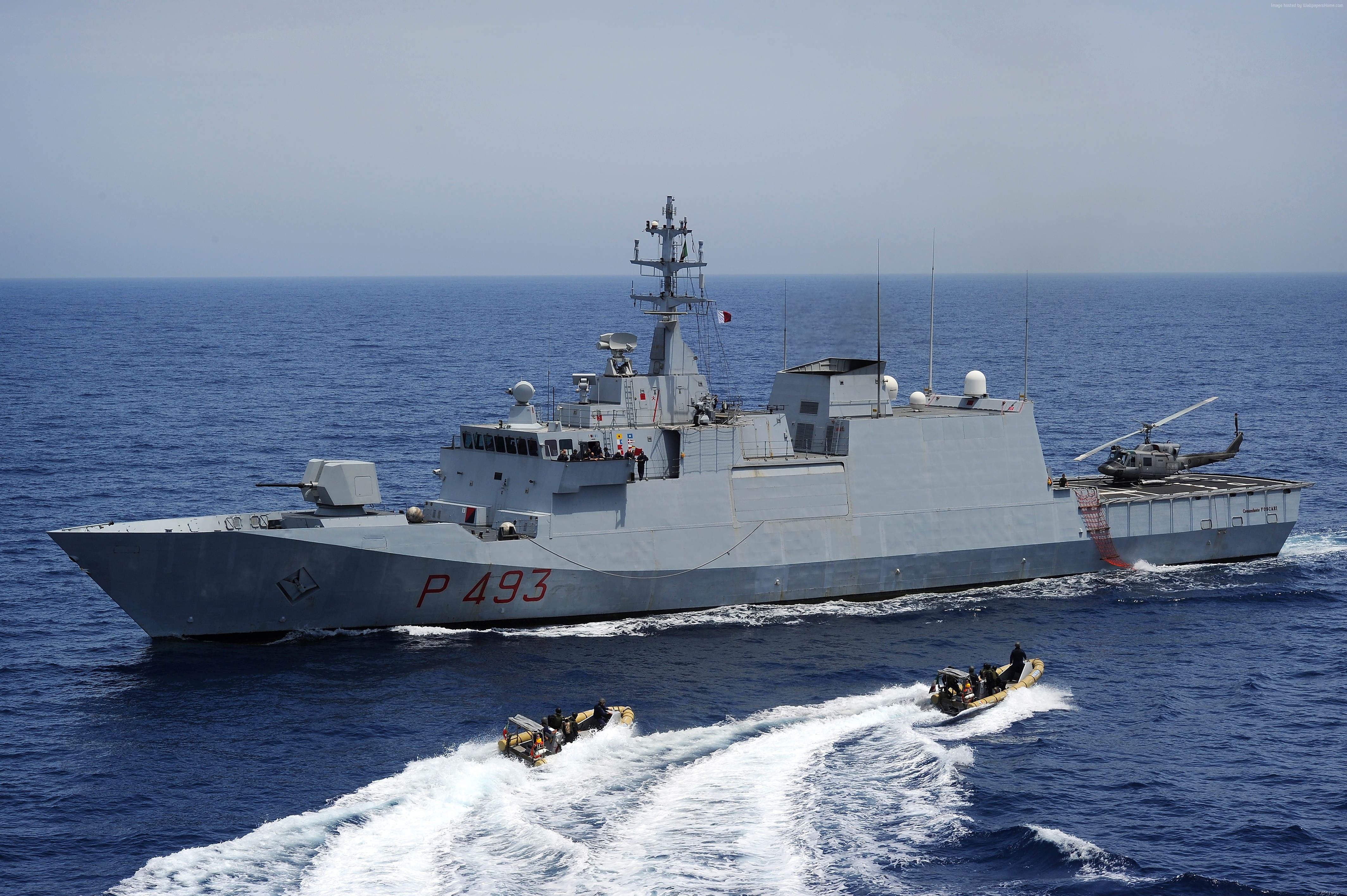 Description: A large boat in the ocean with a smaller boat in the water behind it and a smaller boat in the water behind it.