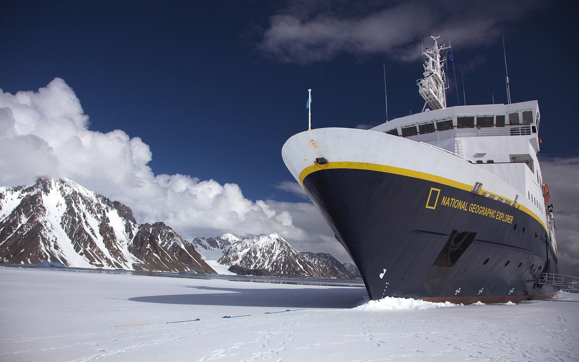 Description: A large boat is sitting in the snow near mountains and clouds in the sky.