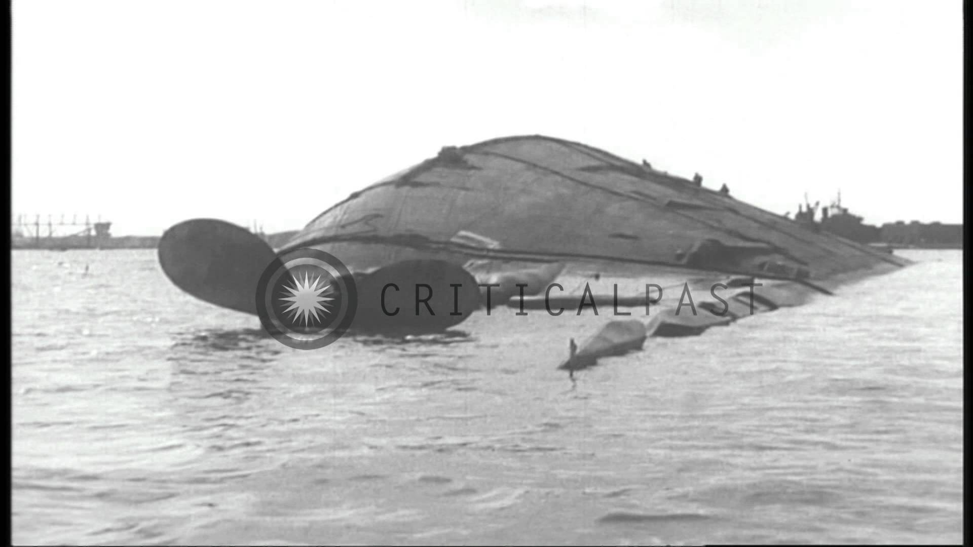 Description: A large boat floating in the water with a bird standing on it's side and another boat in the background.