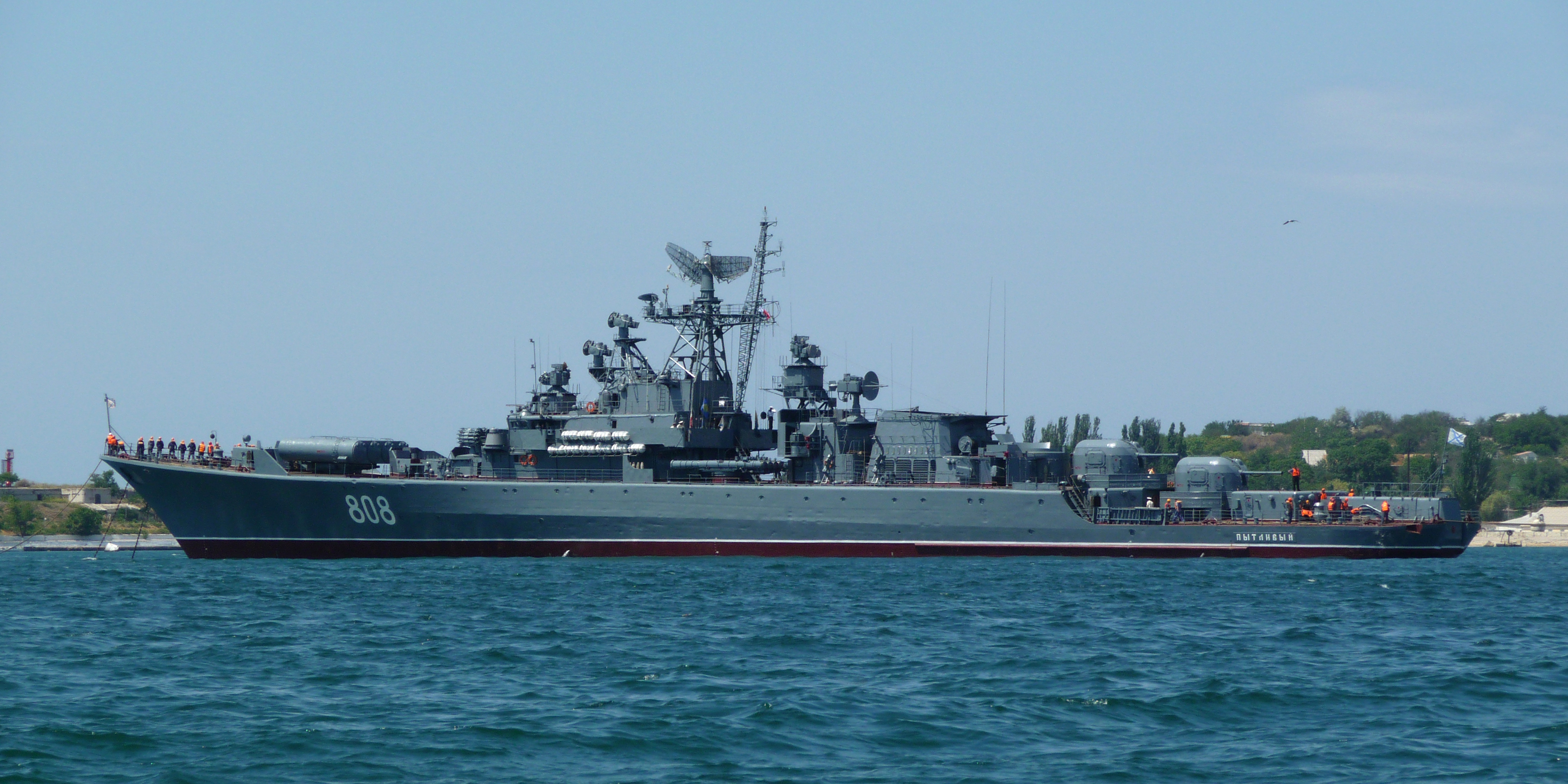 Description: A large boat in the water near a shore line with trees in the background and a boat in the water.