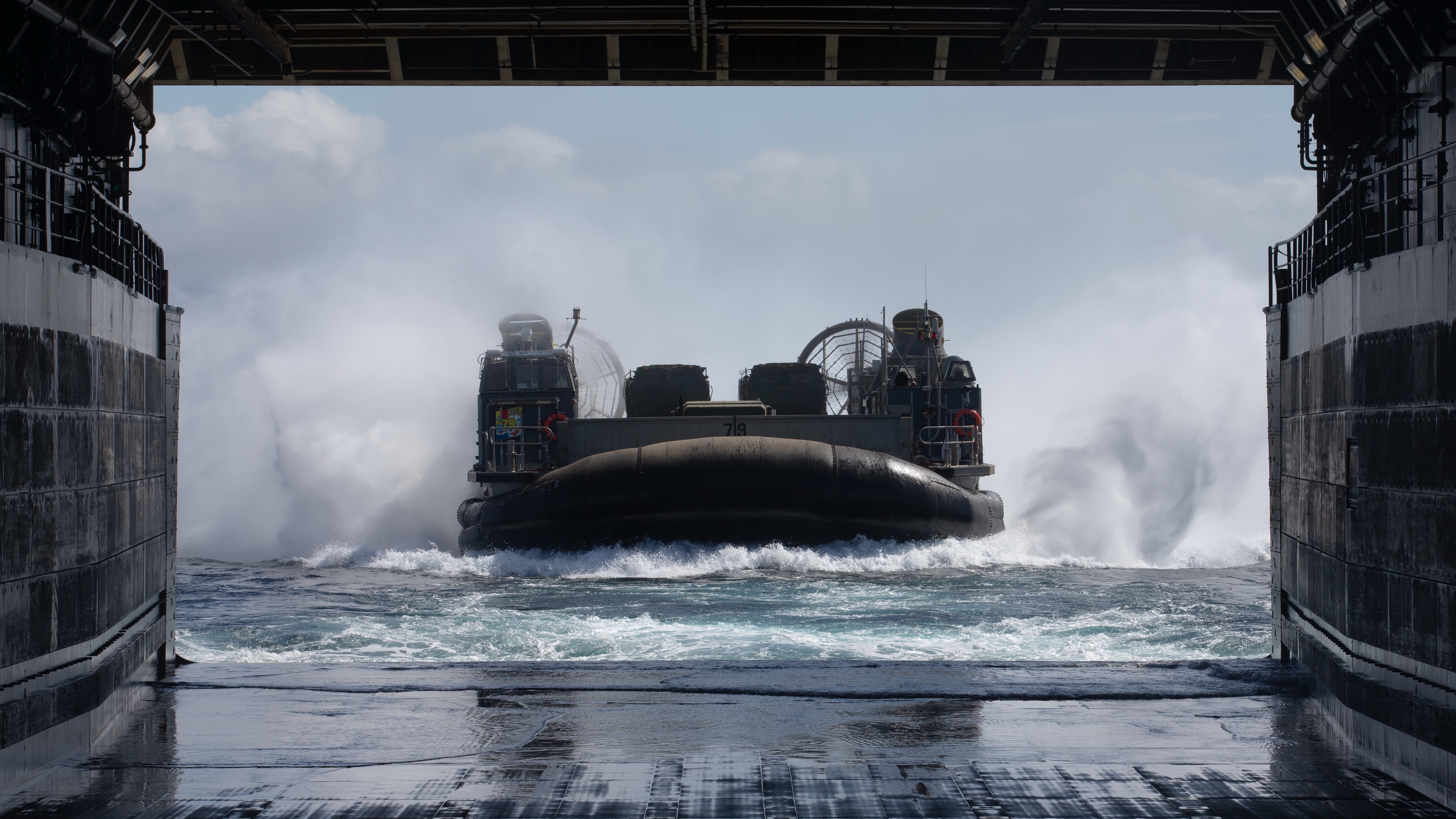 Description: A large boat in the middle of a body of water with a spray of water behind it and a boat in the middle of the water.