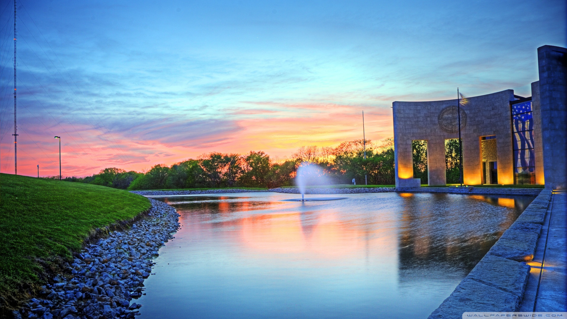 Description: A large body of water with a fountain in the middle of it at sunset or dawn with a colorful sky.