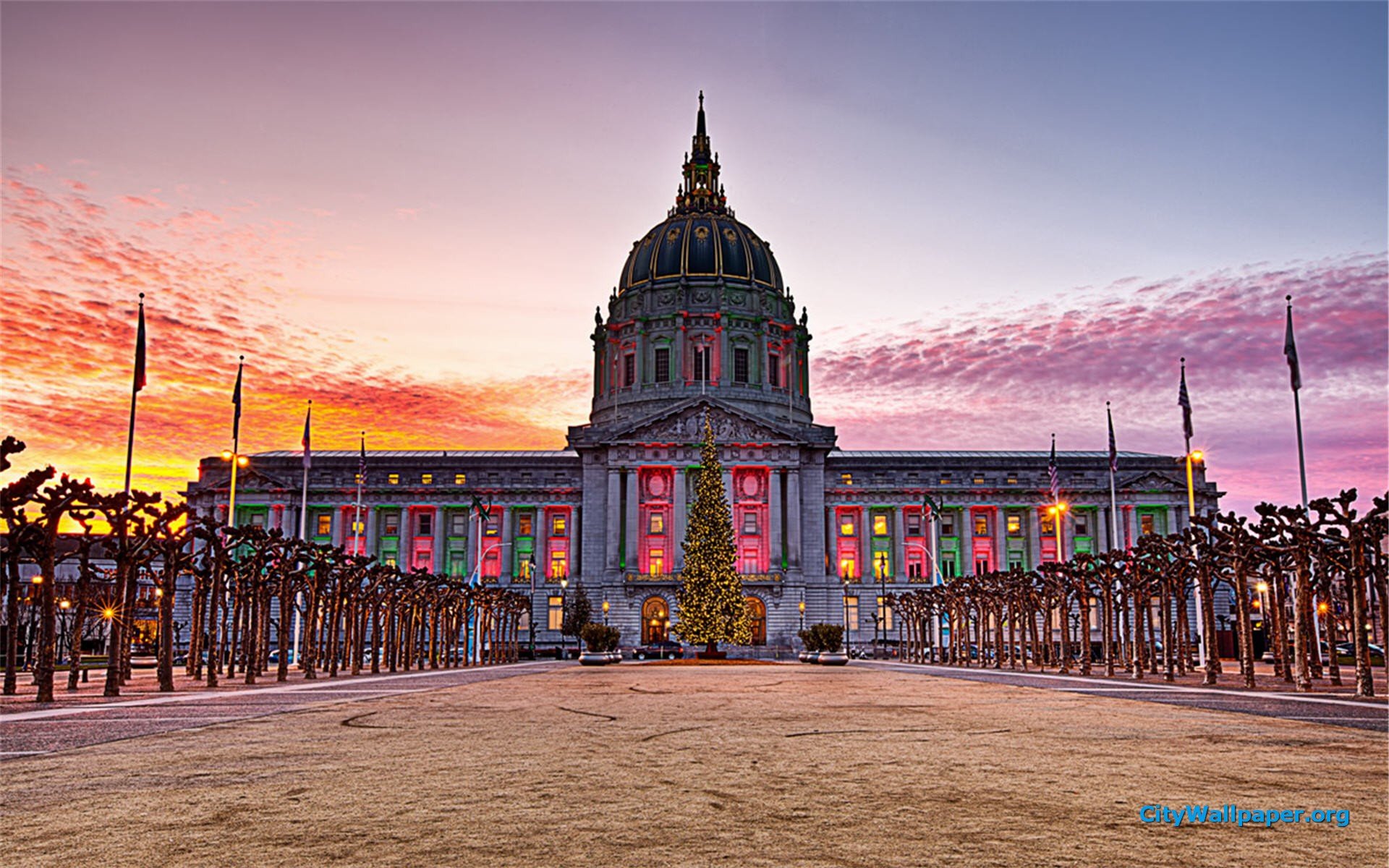 Description: A large building with a christmas tree in front of it at sunset or dawn with a pink sky in the background.