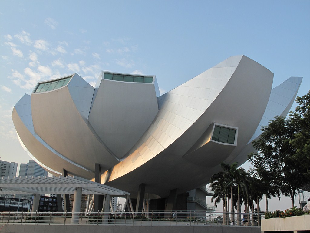 Description: A large building with a large circular structure on top of it's side and a tree in front of it.