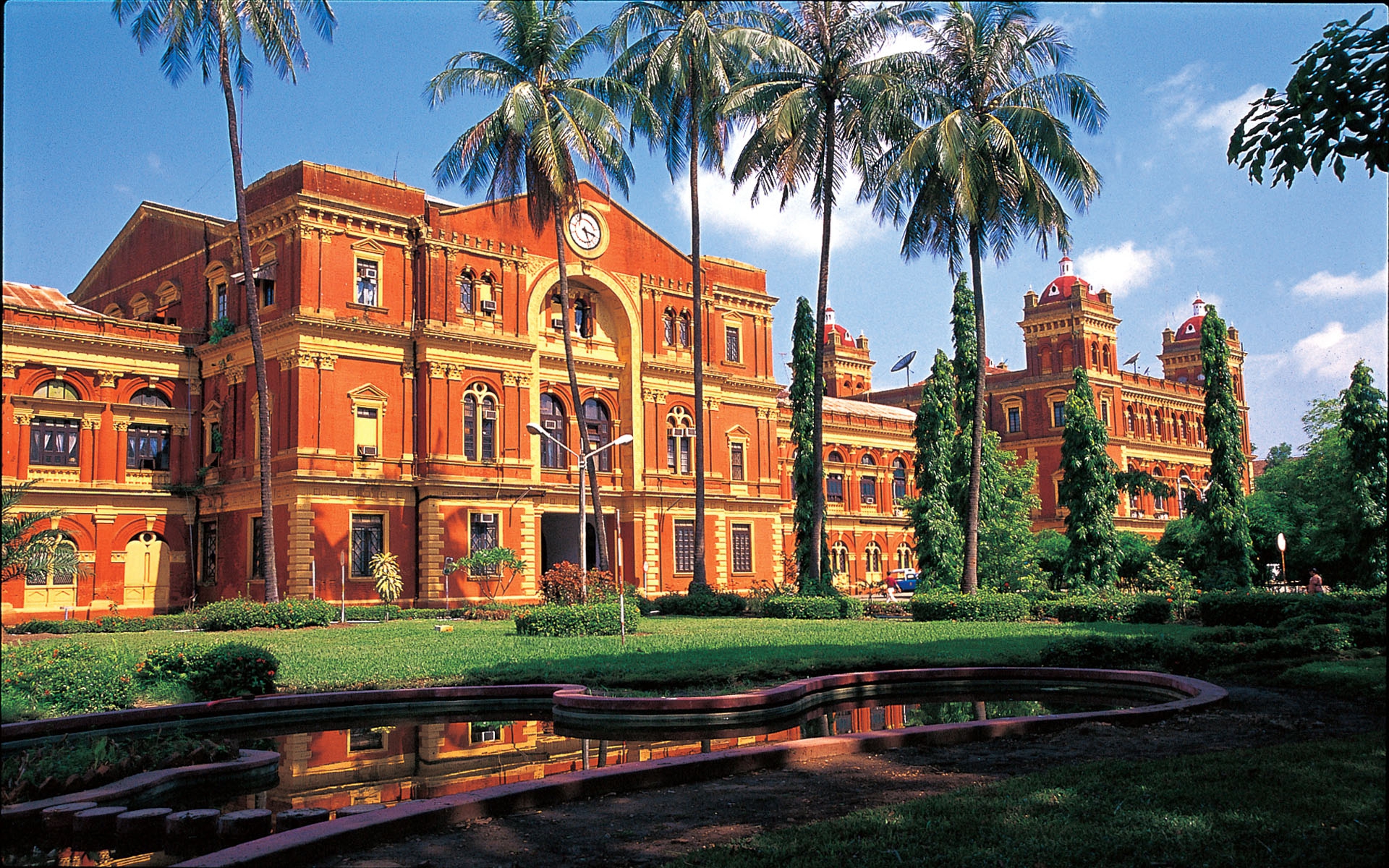 Description: A large building with a clock on the front of it and palm trees in front of it and a pond in front of it.
