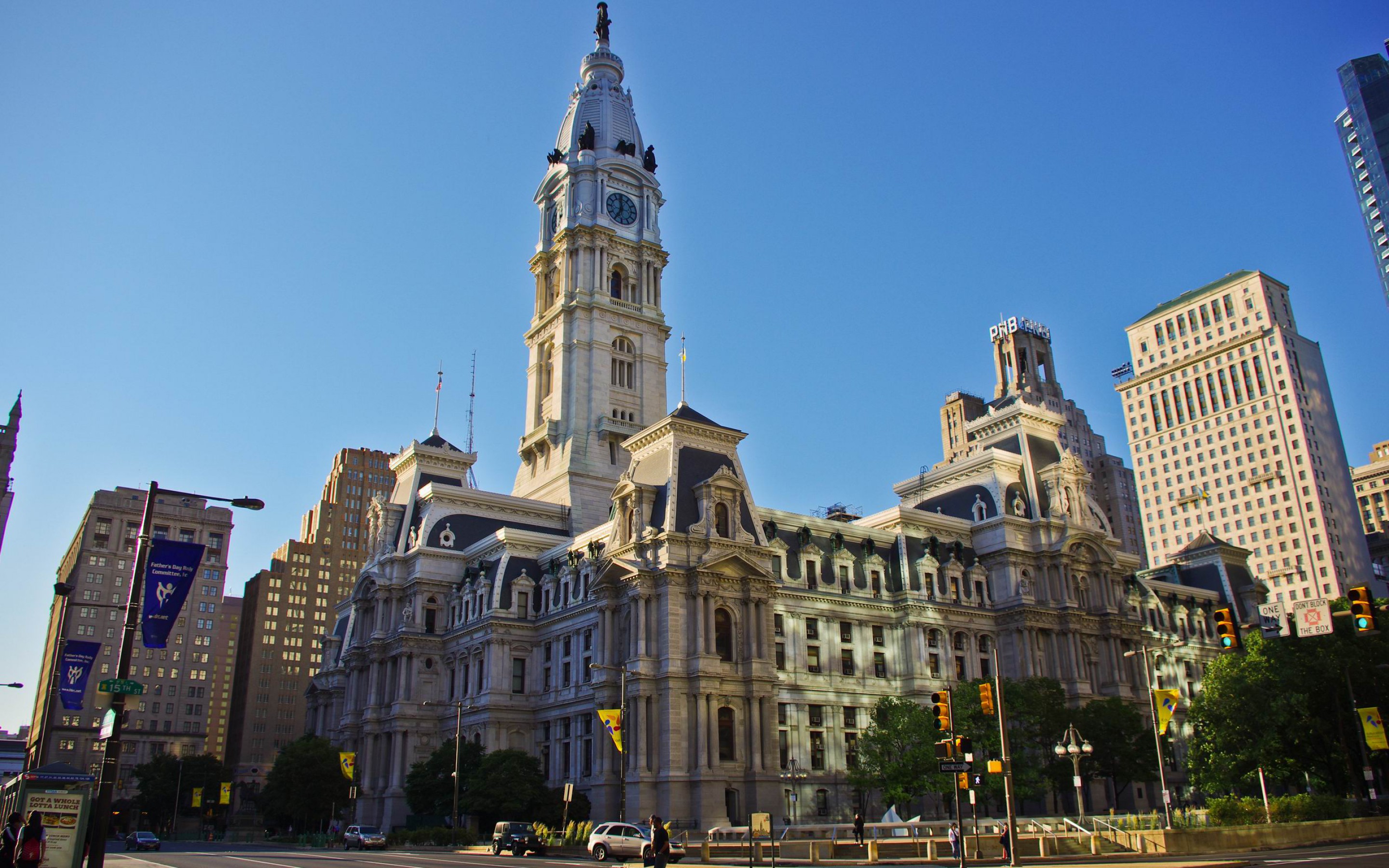 Description: A large building with a clock tower on top of it's side in a city street with tall buildings.