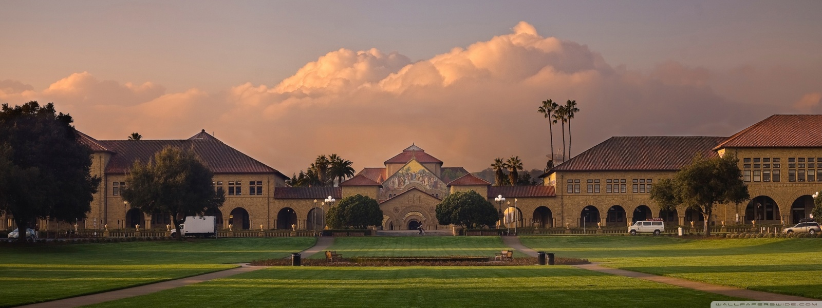 Description: A large building with a clock tower and a fountain in front of it with palm trees in the background.