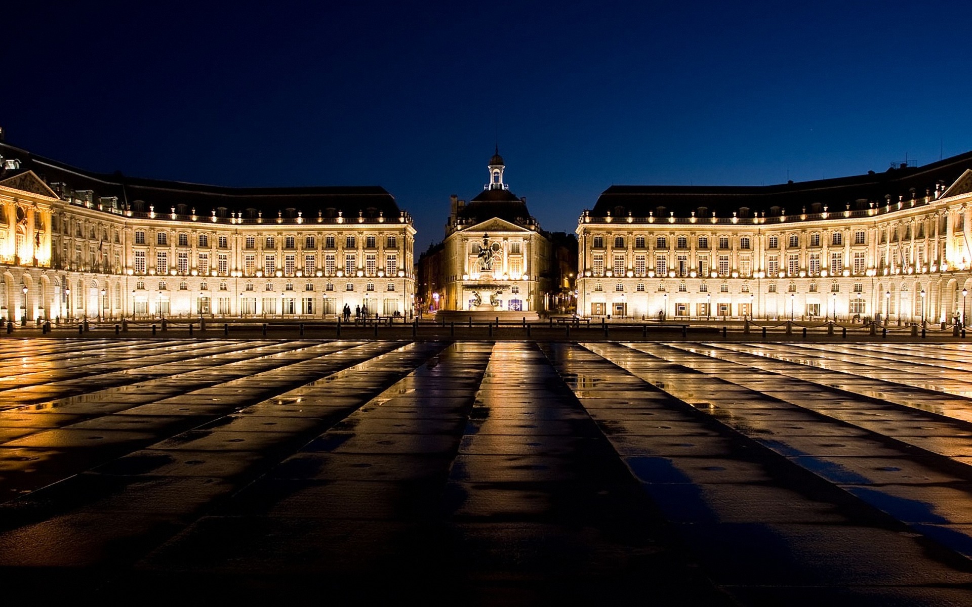 Description: A large building with a clock tower at night time with a fountain in front of it and a clock tower in the background.