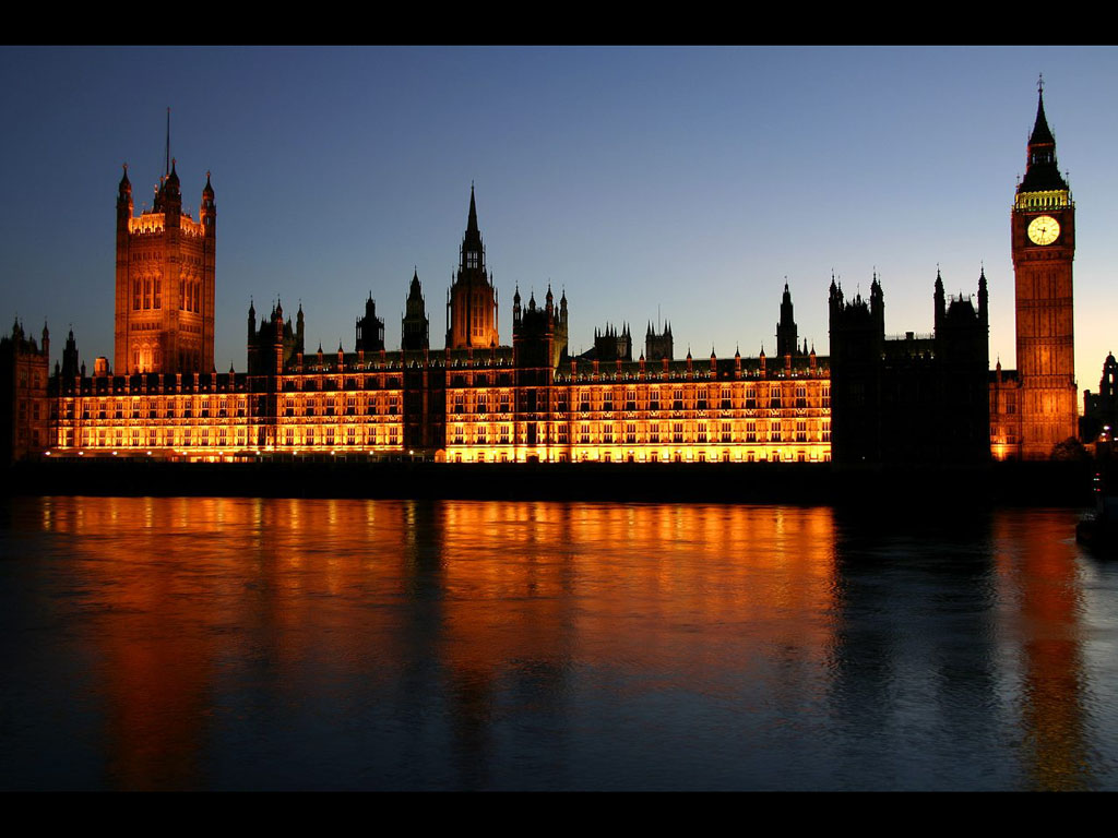 Description: A large building with a clock tower next to a body of water at night time with a boat in the water.