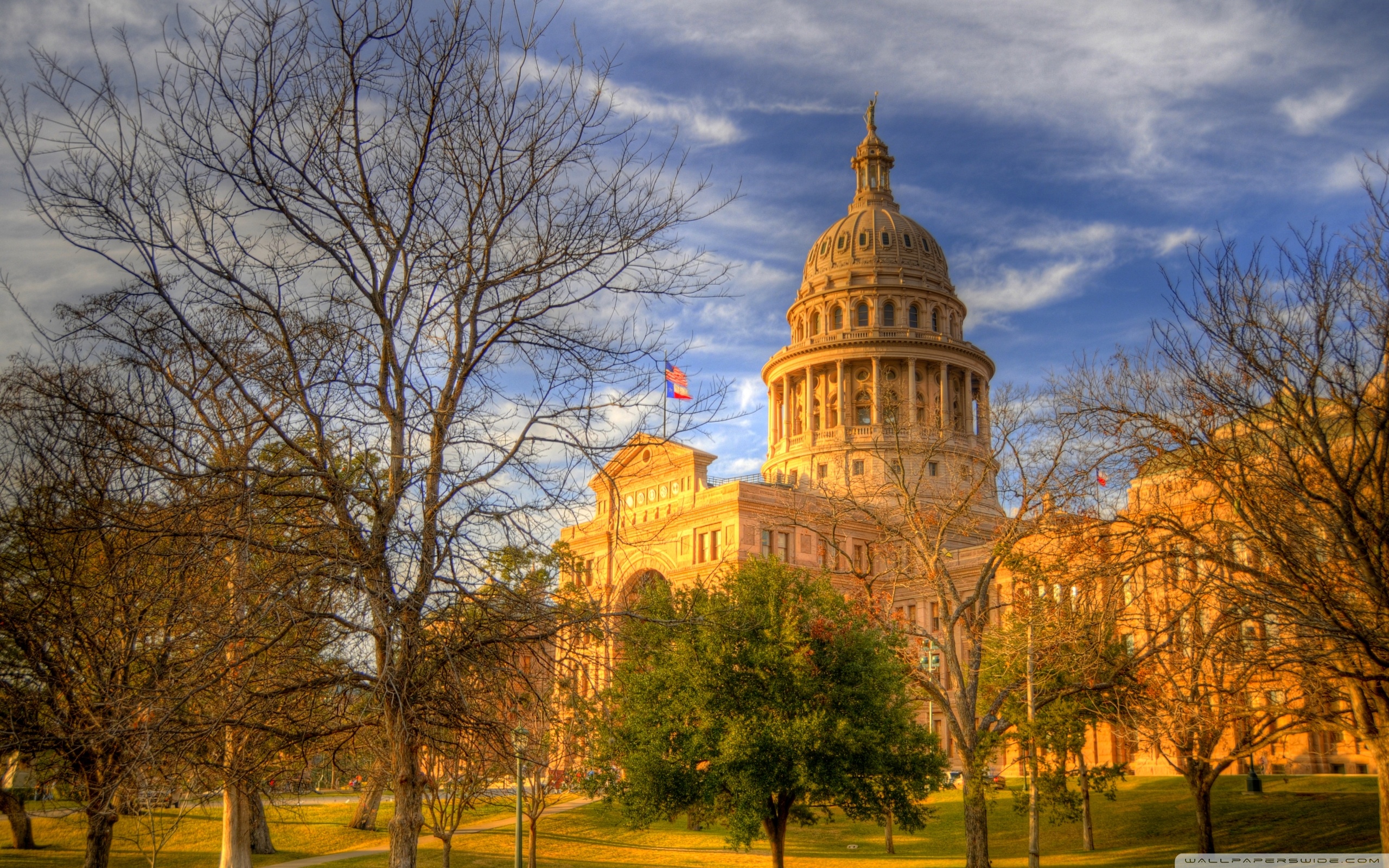 Description: A large building with a dome and trees in front of it and a blue sky with clouds above it.