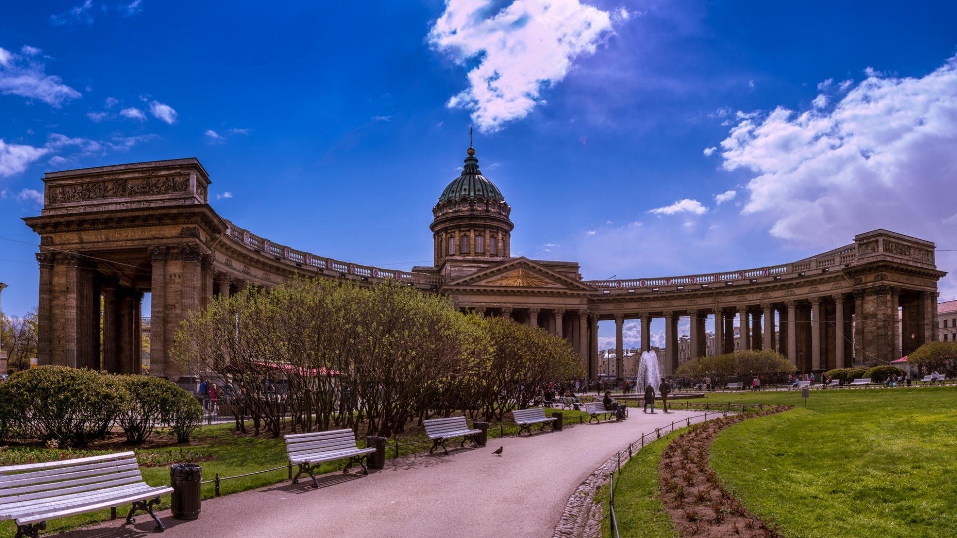 Description: A large building with a dome and a walkway in front of it with benches in front of it and a fountain in the middle.
