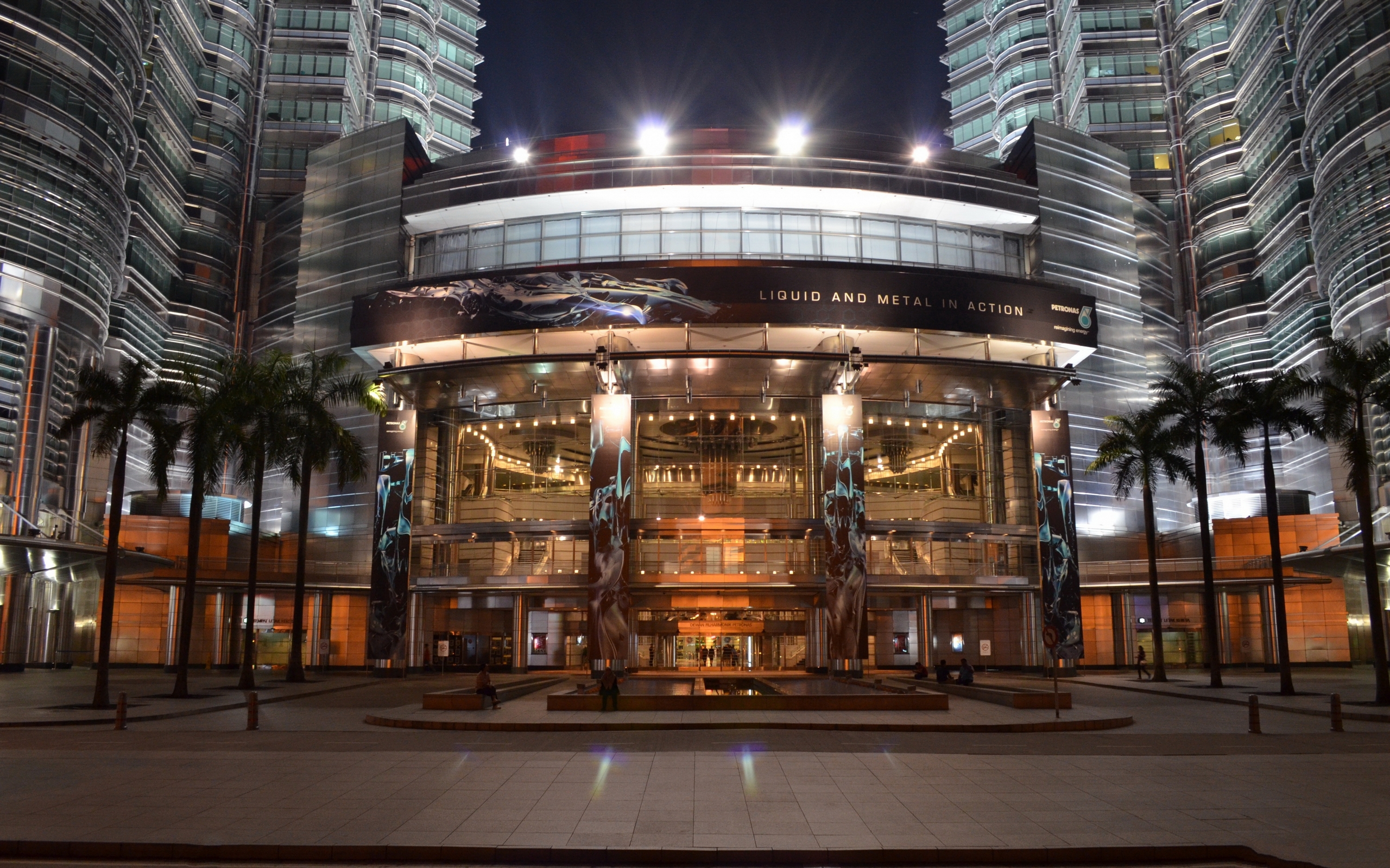Description: A large building with a lot of windows and lights on it's sides and a fountain in front of it.