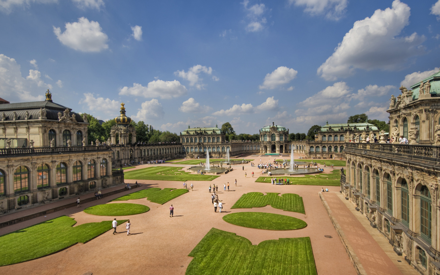 Description: A large building with a lot of green grass in front of it and a fountain in the middle of the building.
