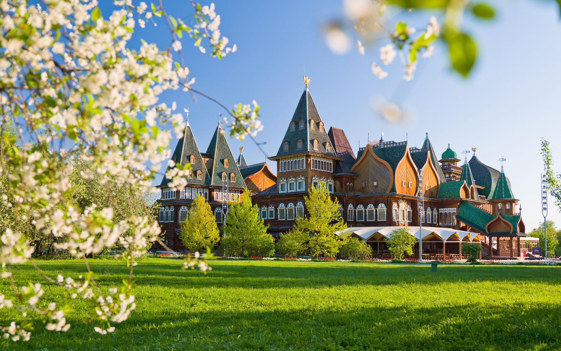 Description: A large building with a green roof and a green lawn in front of it and a tree with white flowers.