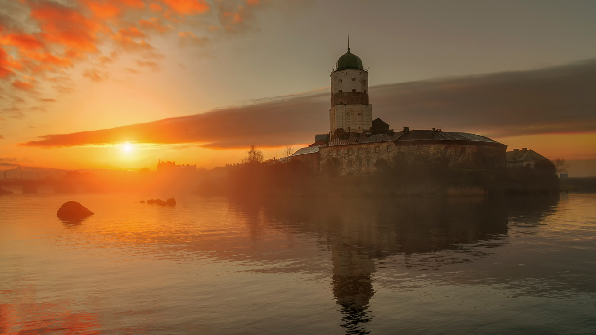 Description: A large building sitting on top of a lake next to a forest covered hillside at sunset with a boat in the water.