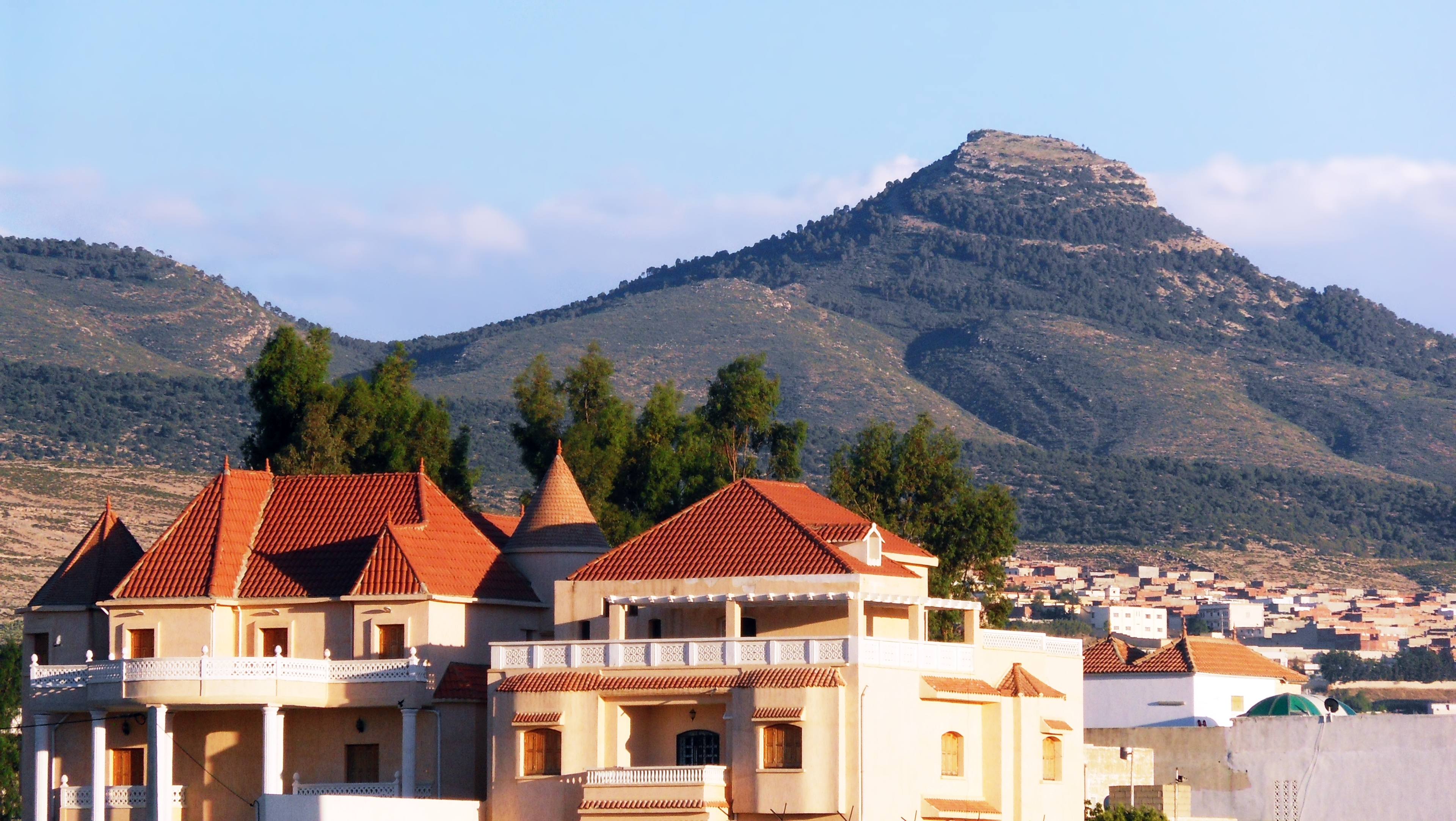 Description: A large building with a mountain in the background and a sky background with clouds in the sky and a few trees in the foreground.