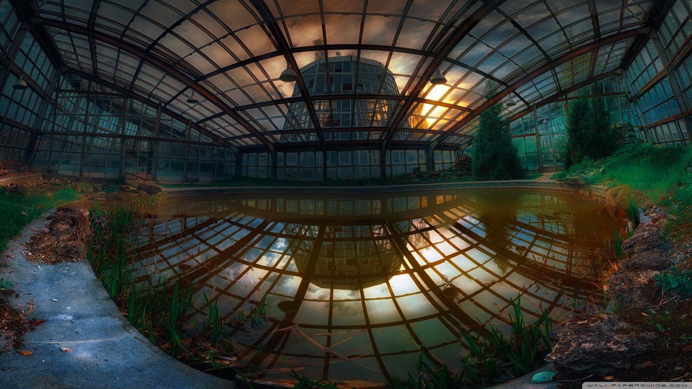 Description: A large building with a pond inside of it at night time with the sun shining through the windows and reflecting the surrounding buildings.