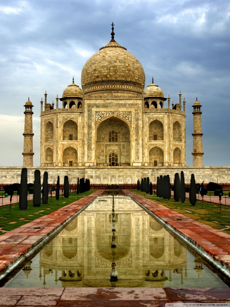 Description: A large building with a large pool of water in front of it and a sky background with clouds in the sky.