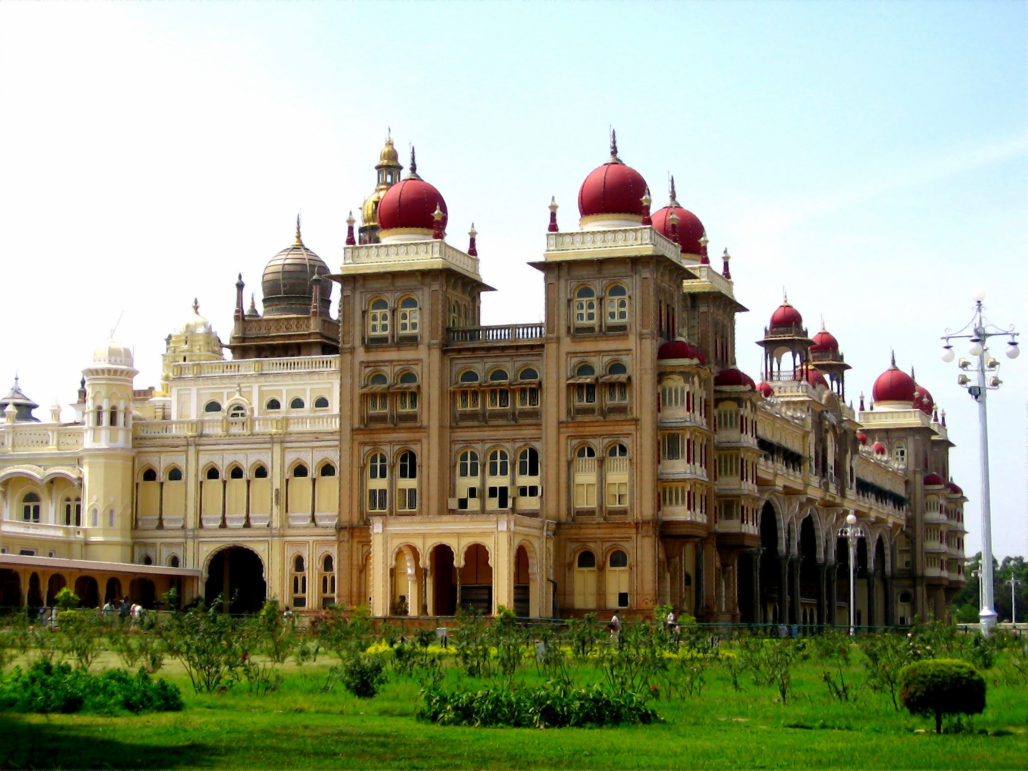 Description: A large building with red domes on top of it's roof and a green field below it with a few bushes.