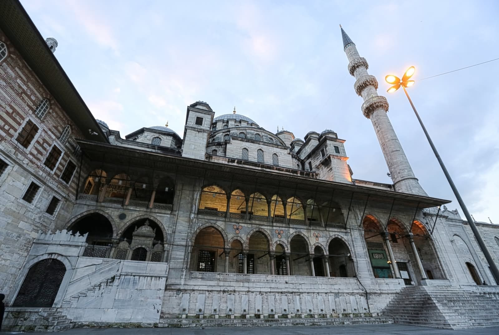 Description: A large building with a tall tower and a clock on it's side and a light pole in front of it.