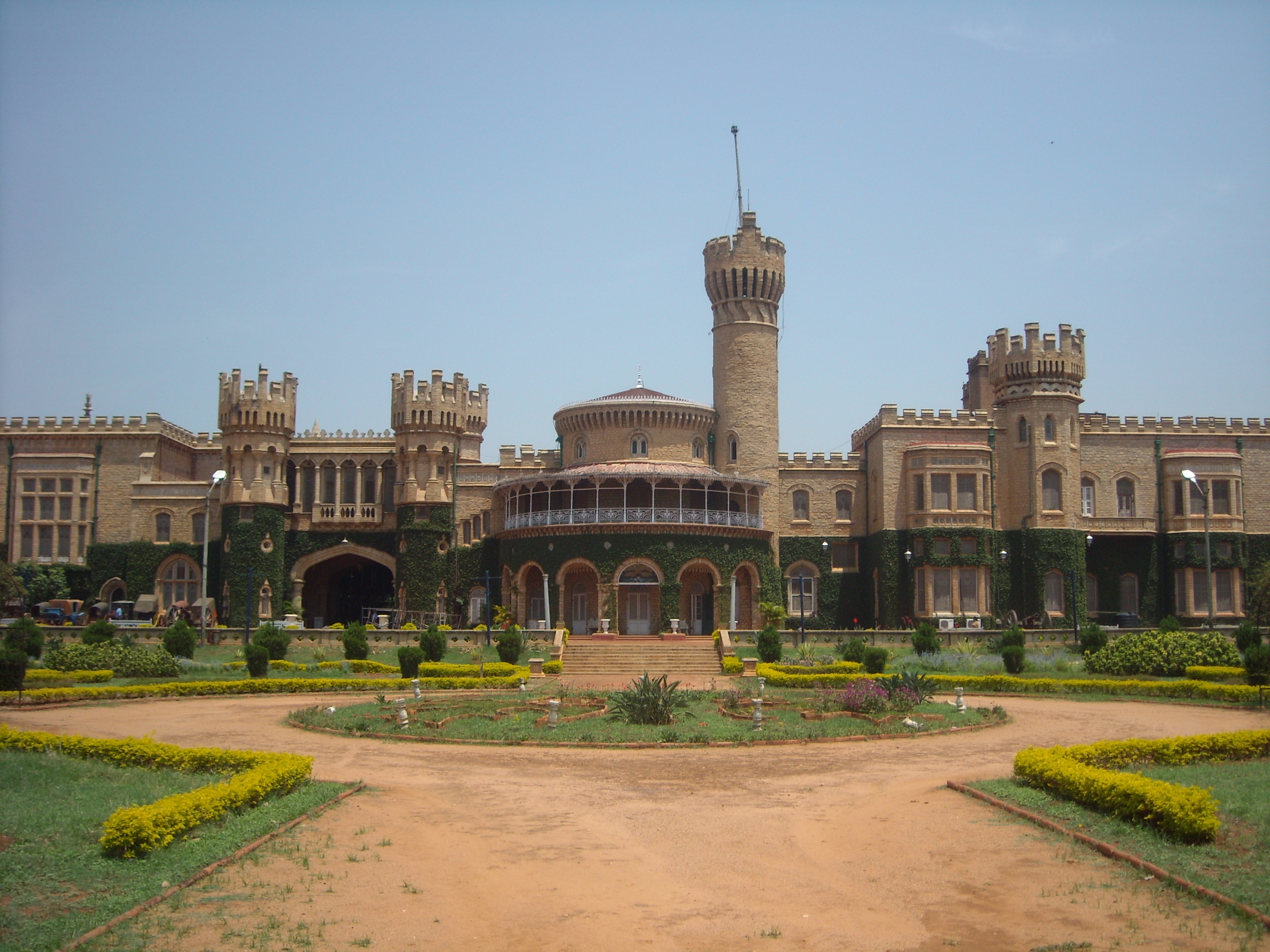 Description: A large building with a tower and a clock tower in the middle of a garden area with a dirt path.