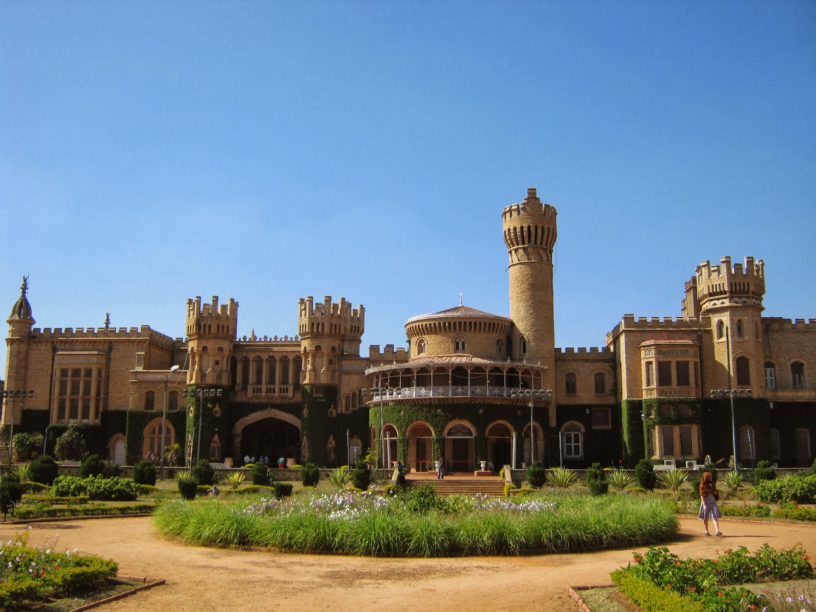 Description: A large building with a tower and a clock on it's side and a garden in front of it.