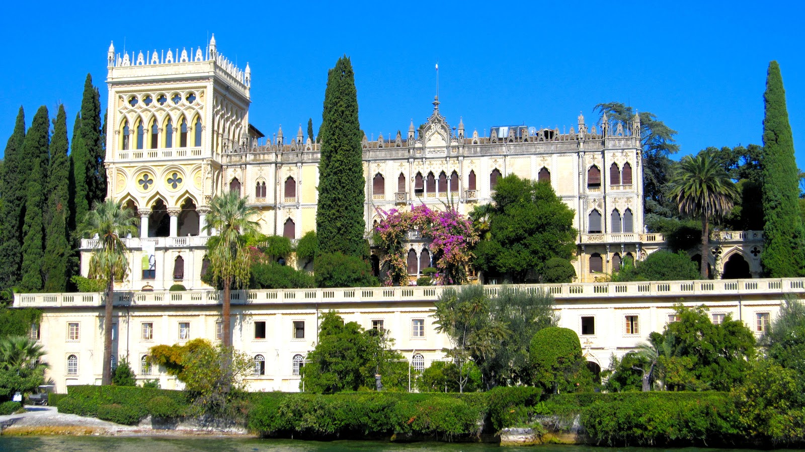 Description: A large building with a tower and a clock on it's side next to a body of water.
