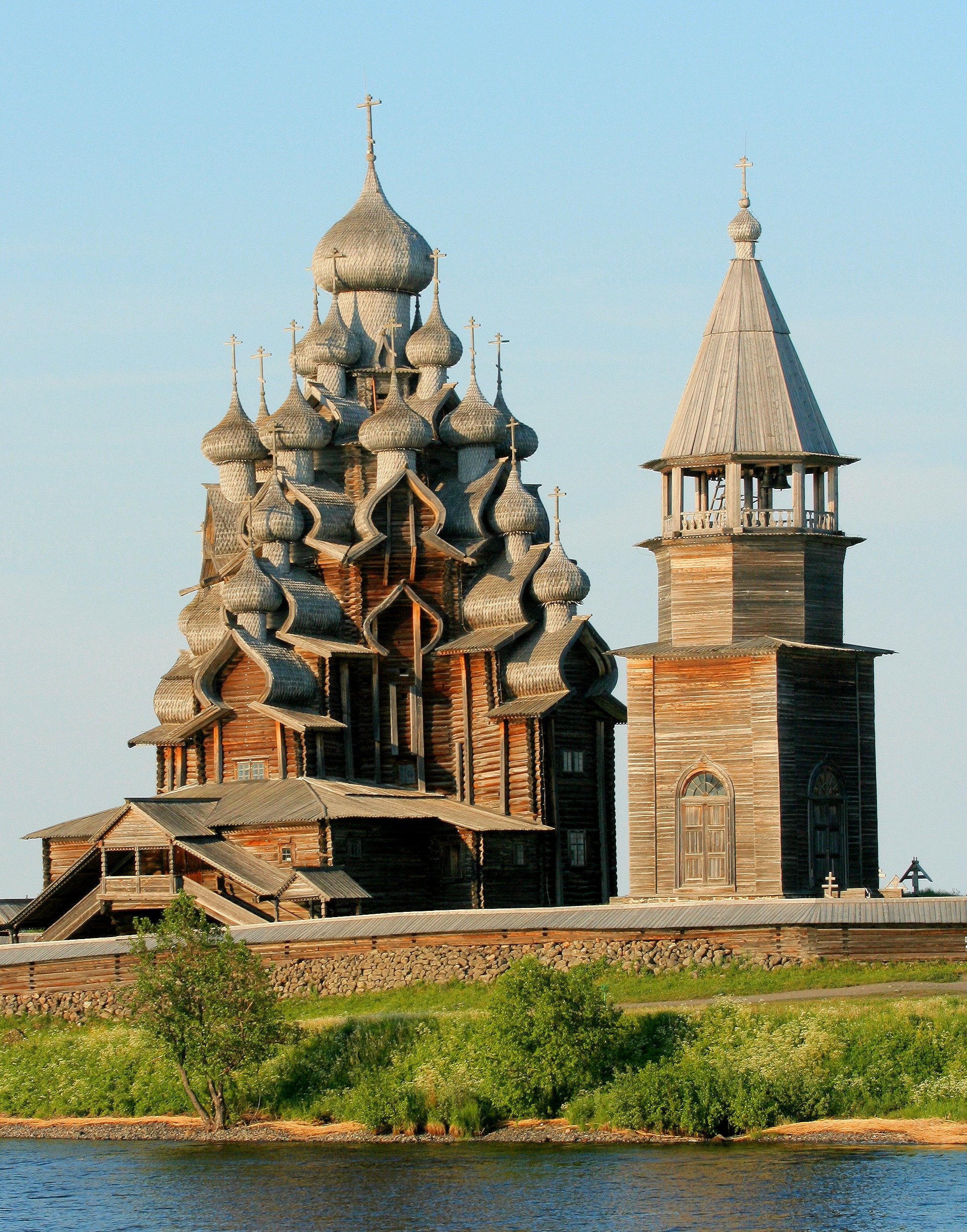 Description: A large building with a tower and a clock on it's side near a body of water and a bridge.