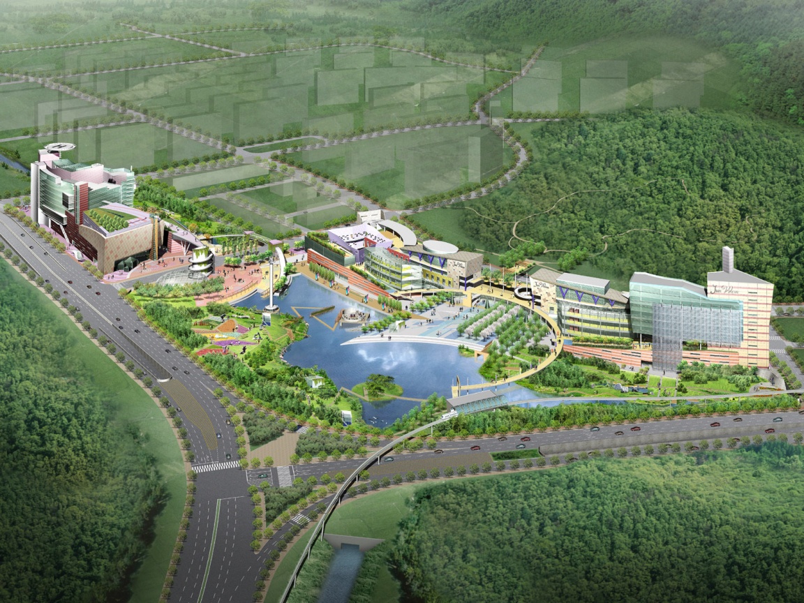 Description: A rendering of a large building surrounded by trees and a river in the middle of the picture is a road and a pond.