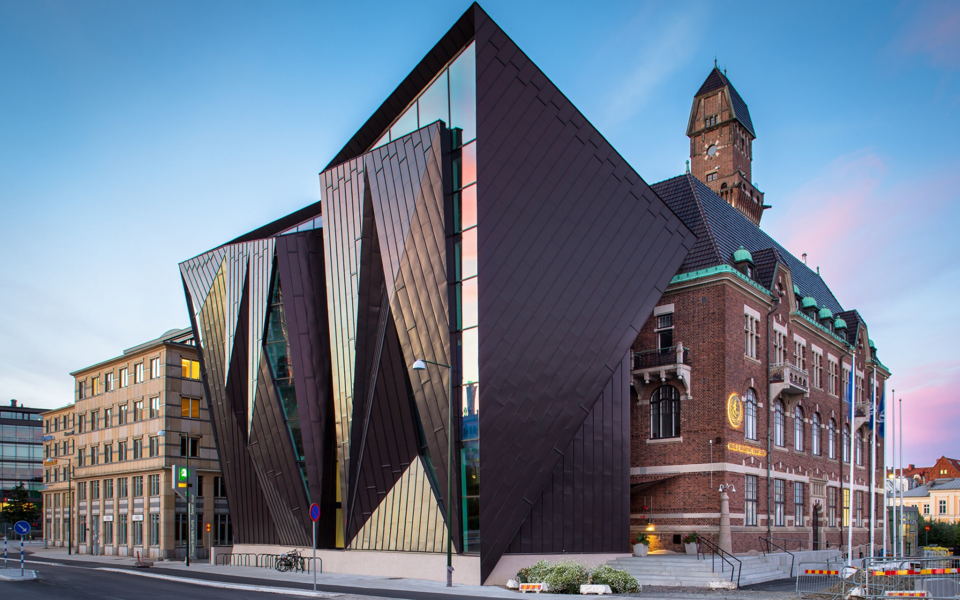 Description: A large building with a triangular design on the front of it's face and a clock tower on the top of it.