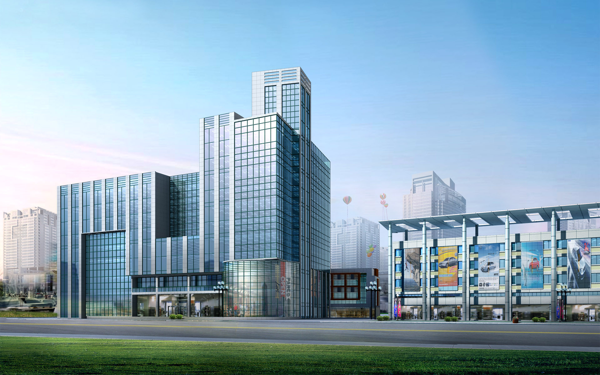 Description: A large building with a lot of windows on it's sides and a lot of grass in front of it.